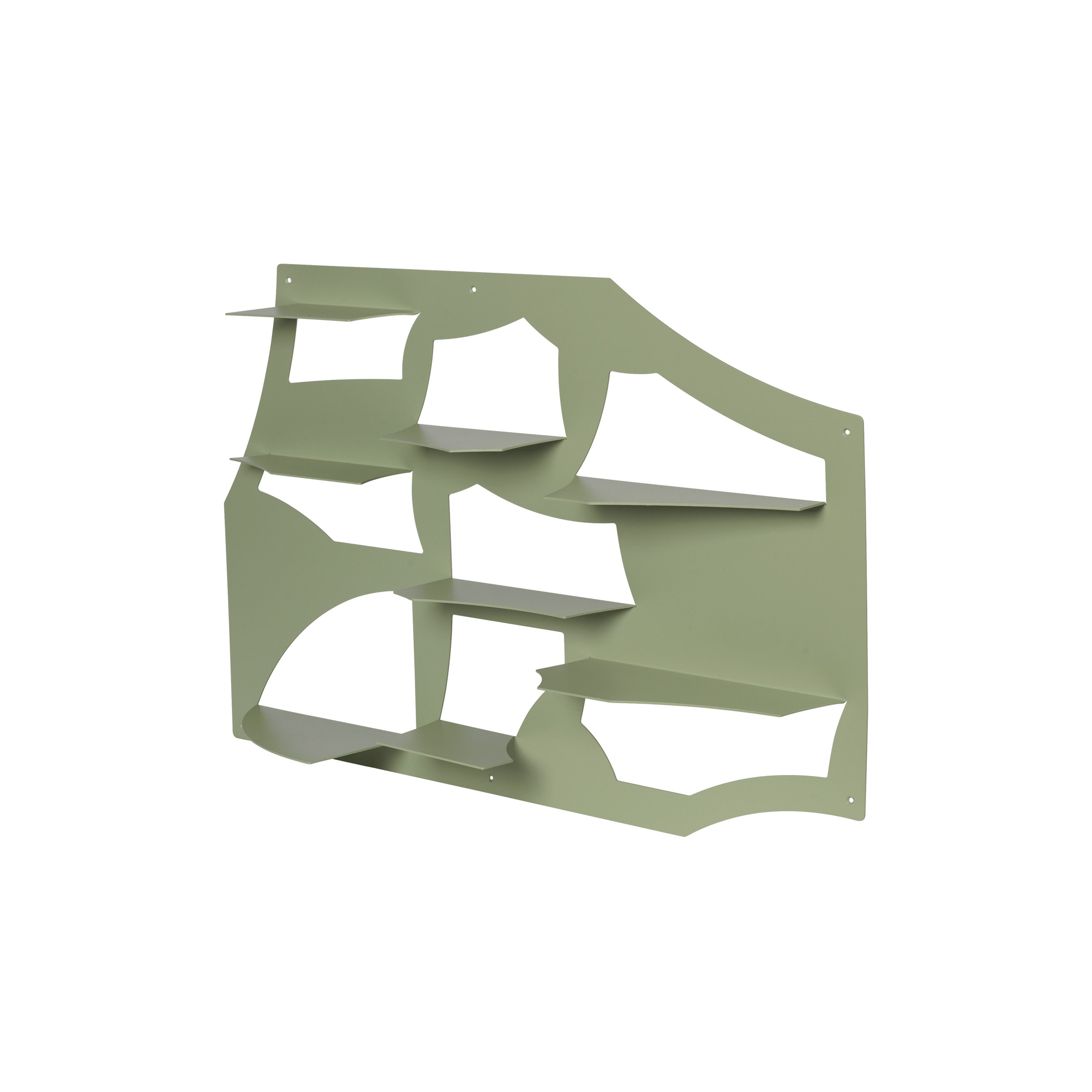 The Leta Shelf is a wall-mounted display crafted from powder-coated steel with laser-cut shapes that create visual depth. Inspired by the traditional Danish sættekasse display box, it is designed for showcasing small items. Available in Cashmere or Tea Green finishes.