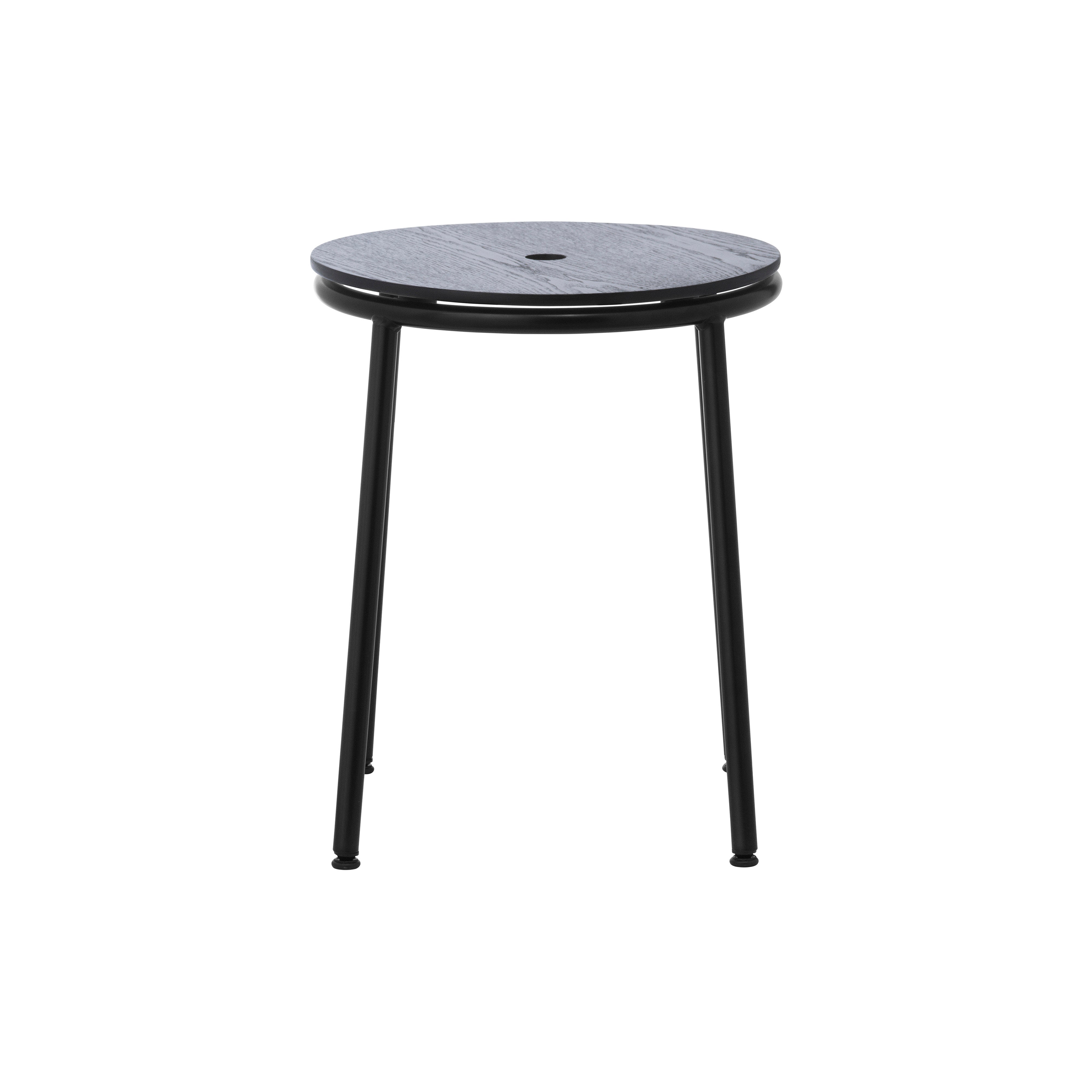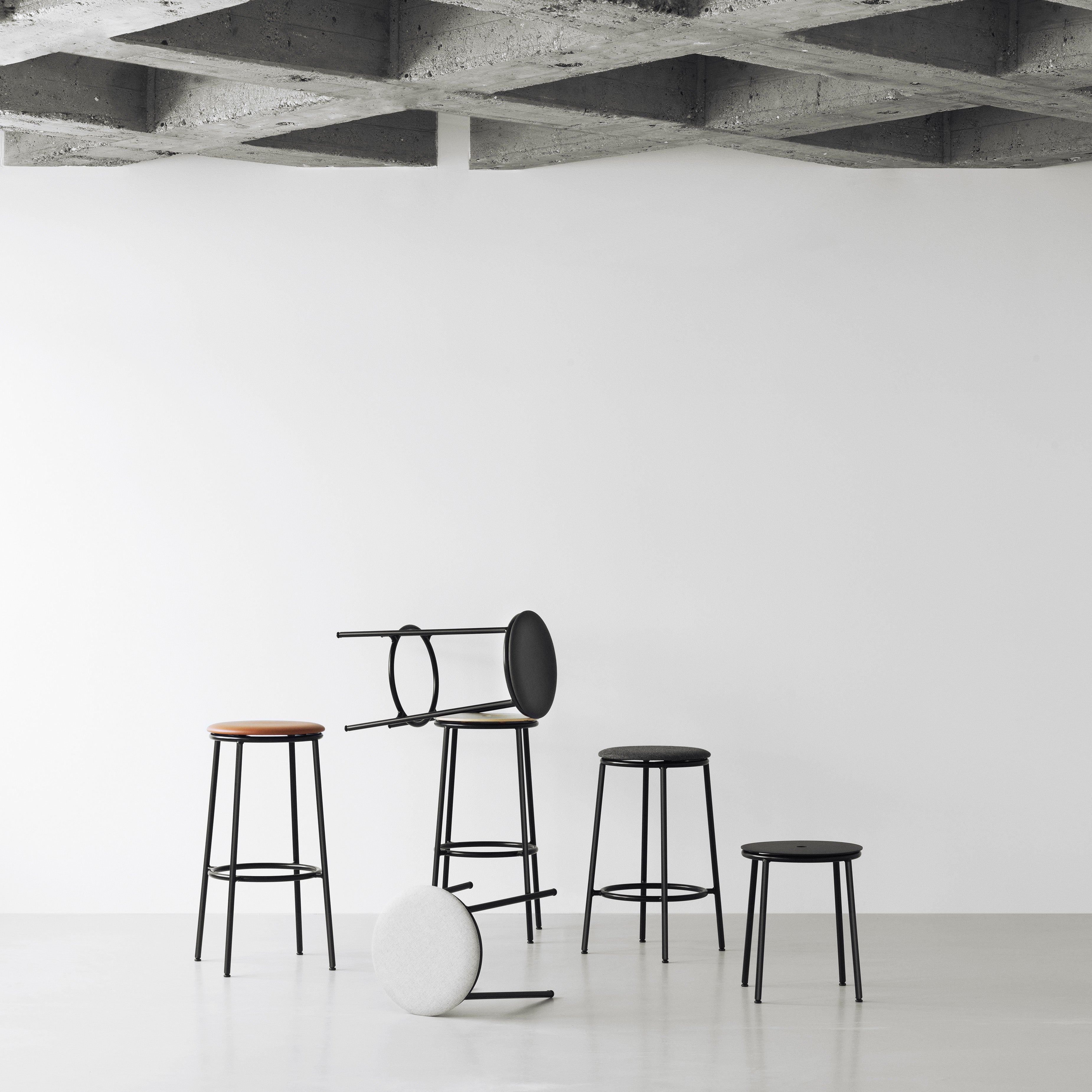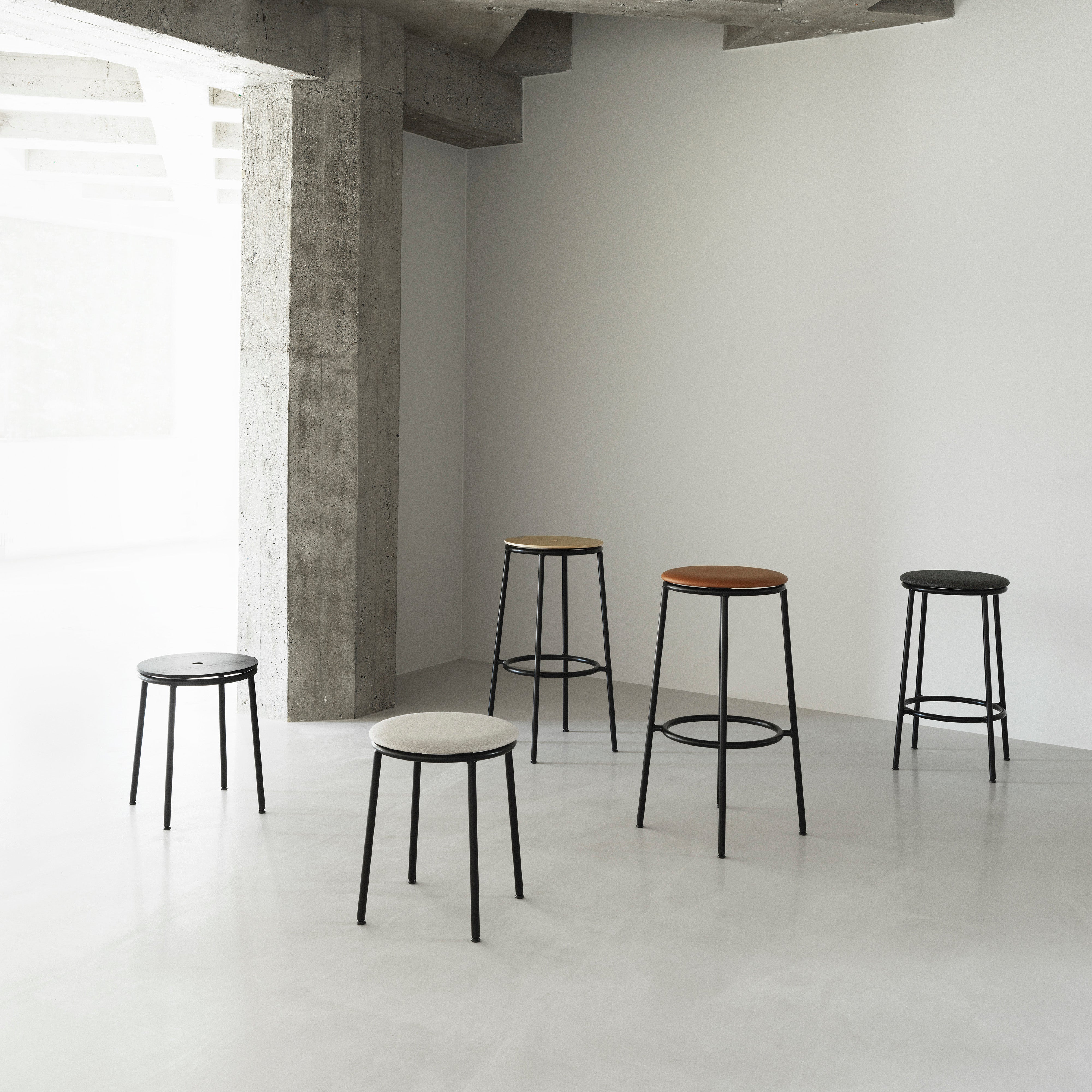 As a solo perch or pulled up to a dining table for extra seating, Circa's telling details embody the timeless spirit of minimalism. Designer Simon Legald elevates the round seat slightly from the steel tubing base in light-handed move that offsets the solidness of its construction. With a small added hole in the center for easily moving the stool around, the seat comes in a choice of natural and black lacquered oak veneer or black powder-coated aluminum.