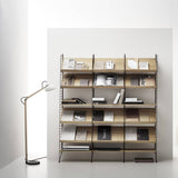 String's versatility comes down to the supporting "threads" interspaced on this floor-oriented panel that connect the units together. When more storage space is needed, add panels and shelves. Choose steel panels in a gloss powder-coat in 3 heights or with a galvanized finish for outdoor use to accommodate any desired shelving configuration.