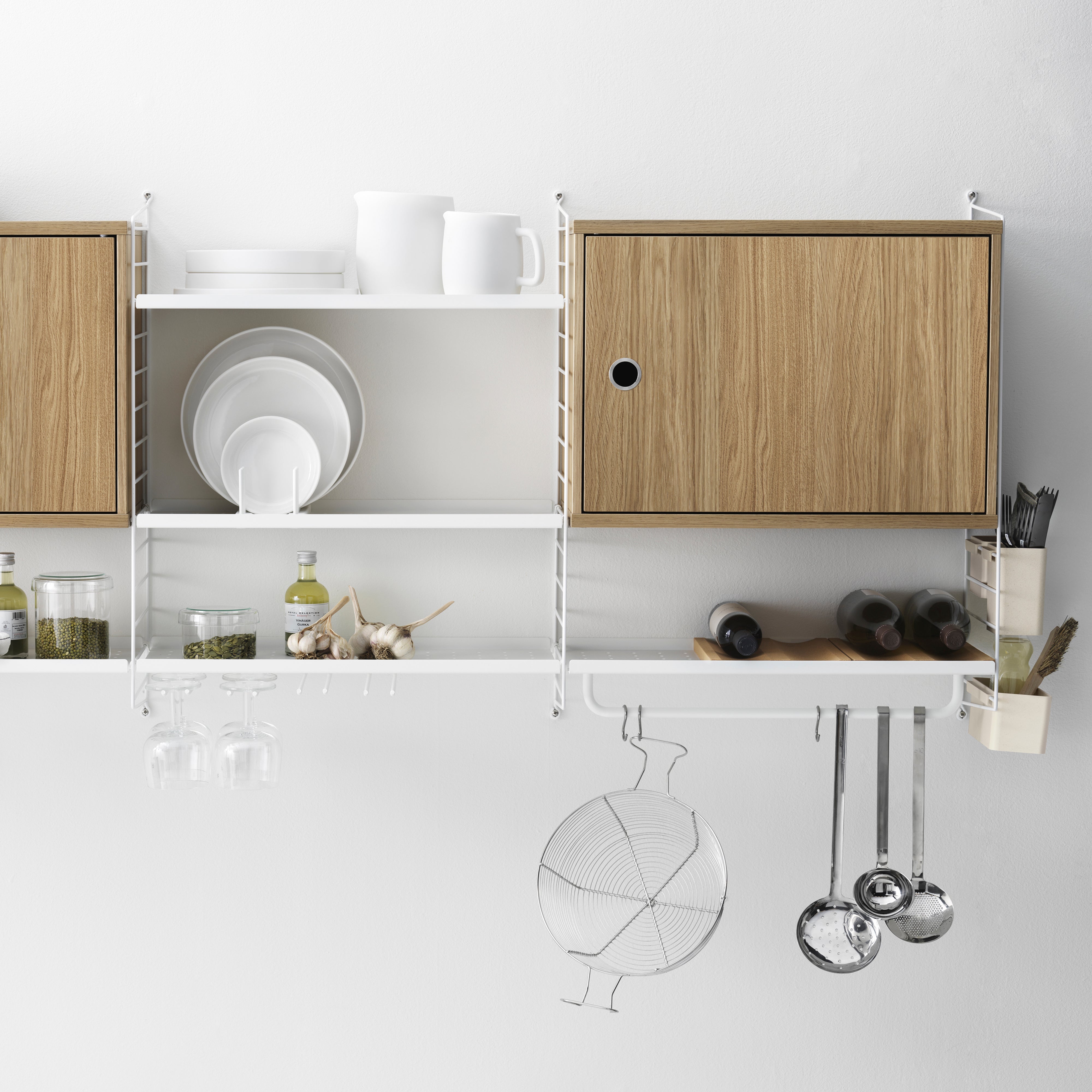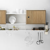Known for its characteristic wire panels, designers Nisse and Kajsa Strinning's iconic shelving system adds a set of 3 convenient organizers. Made from a biocomposite plastic material with 40 percent wood fiber, they can attach to either the String System's 30-cm-deep wire panels or the wire screen from Works. The add-on holders make it easy to store desk accoutrements in the study, utensils in the kitchen or assorted bits and bobs in any room in the house.
