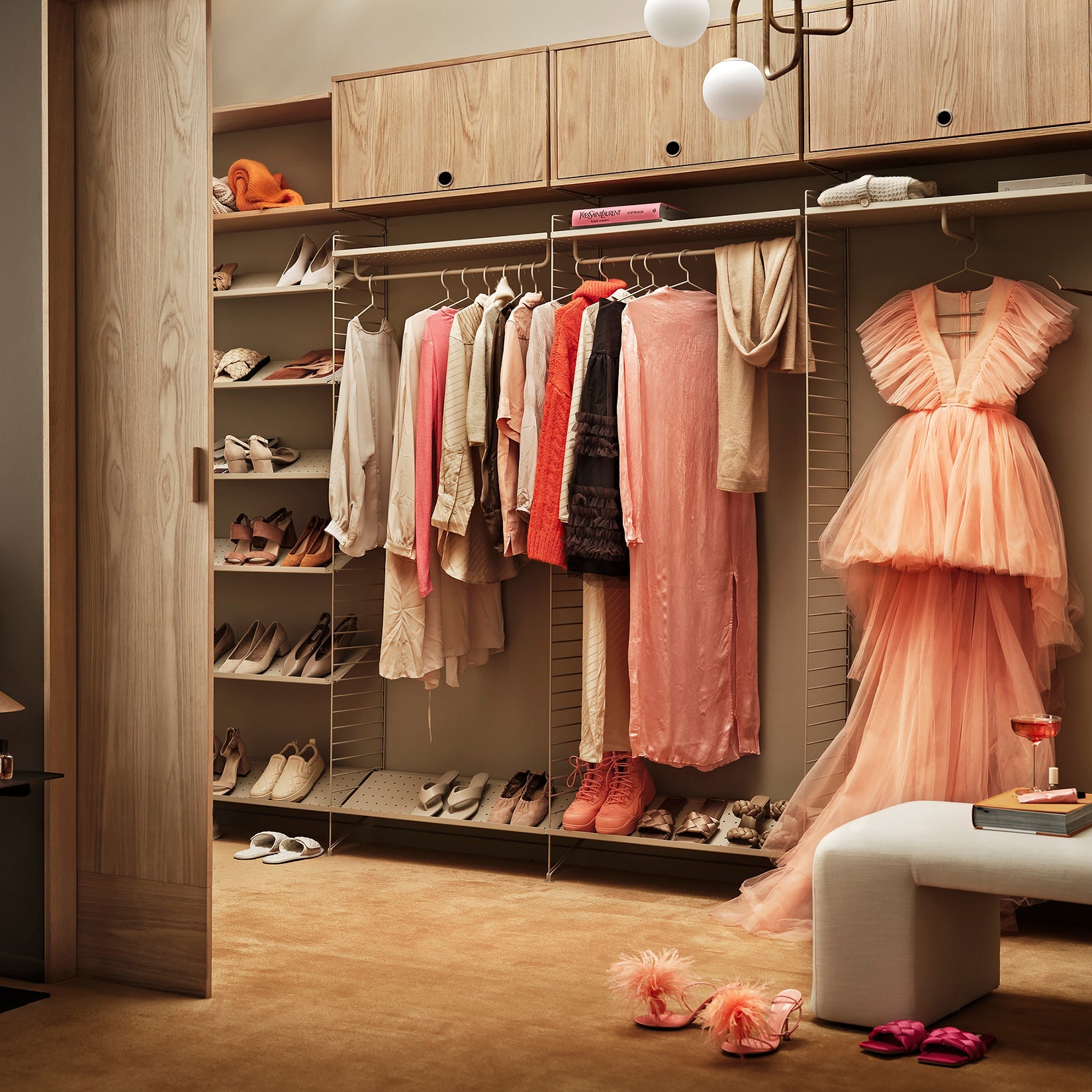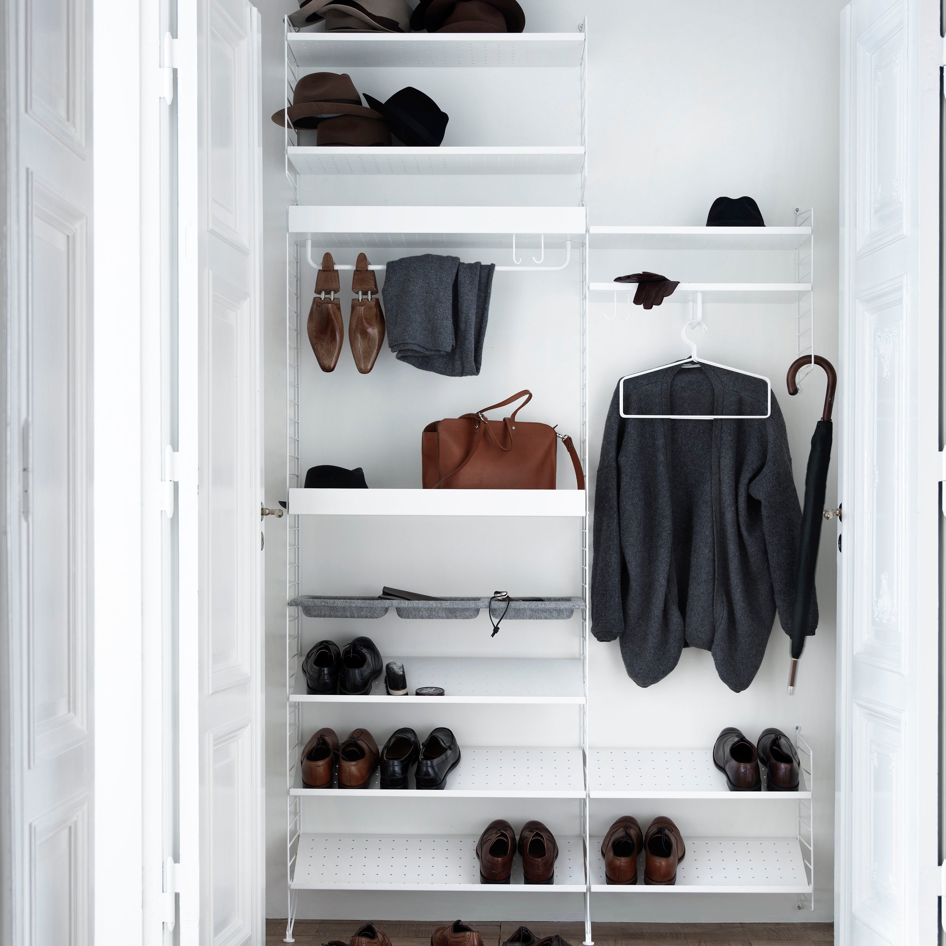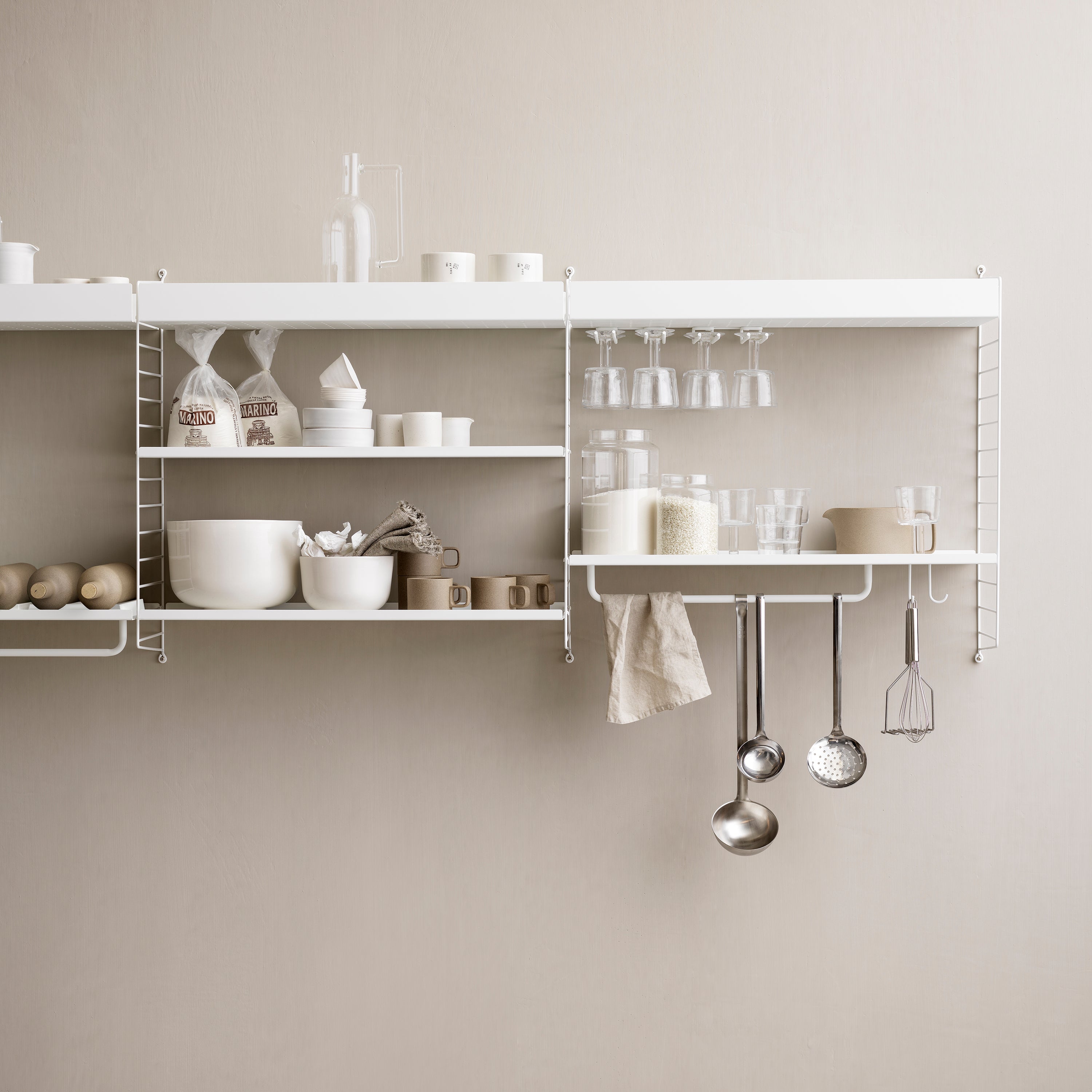 String adds a hanging rod to its storage accessories that fits together with its metal and galvanized shelves. Offered in a trio of sizes and a range of powder-coated colors, the medium and large models are designed to be mounted along the width of the supporting shelf while the smallest rod can be mounted along either the width or depth of the standard 30-cm shelf. Use with coat hangers from the String System or casually drape scarves, shawls or even necessities like the dog leash over the rod.