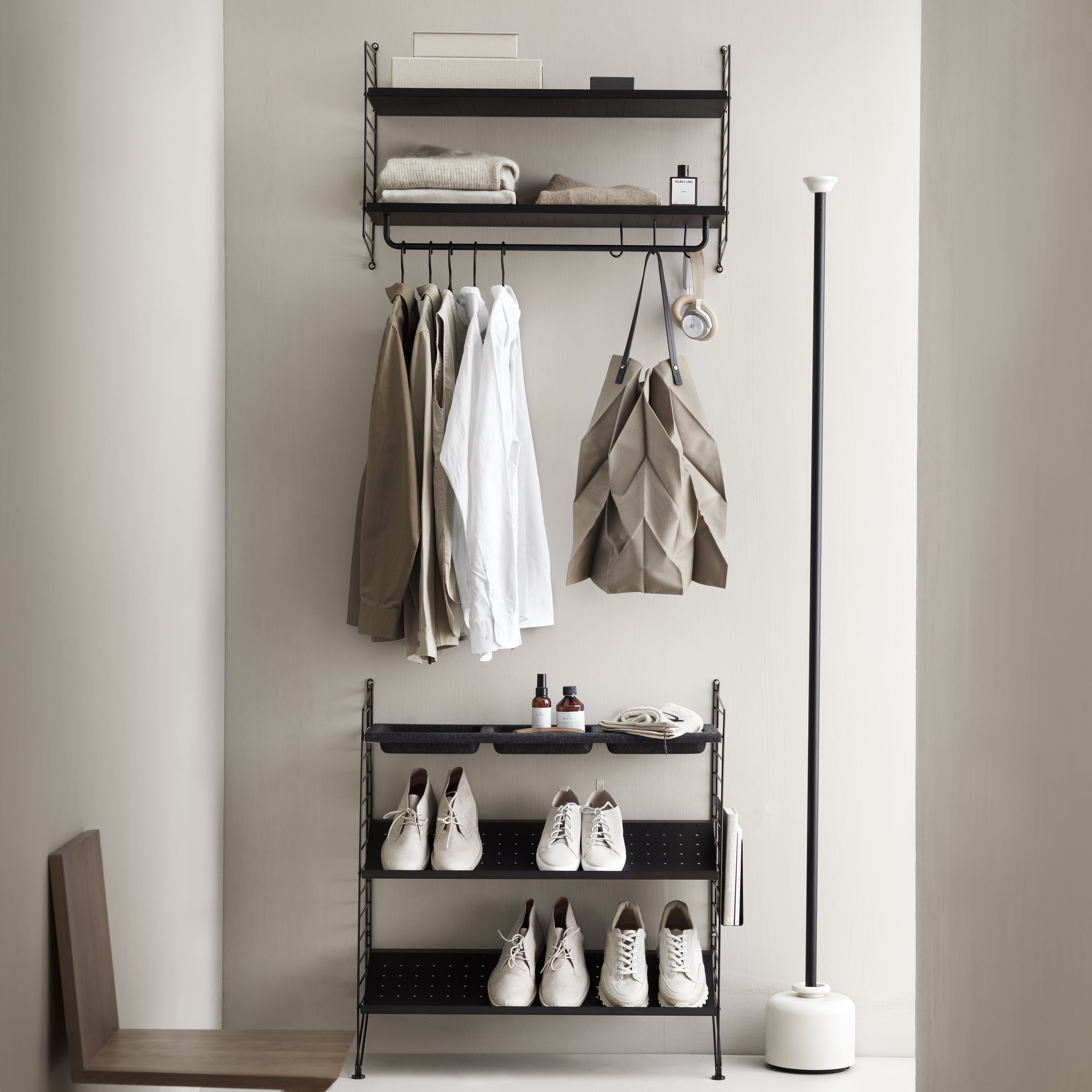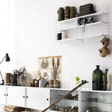 Available in 2 heights and 2 choices of depth, these String support panels provide for a space-saving, wall-mounted installation. Finished in gloss powder coat or with a galvanized treatment for outdoor use, they allow for any configuration of the String storage units and shelves. First introduced in 1949 by the late Nisse Strinning, the versatile system has evolved into a true still sought-after icon of modern design.