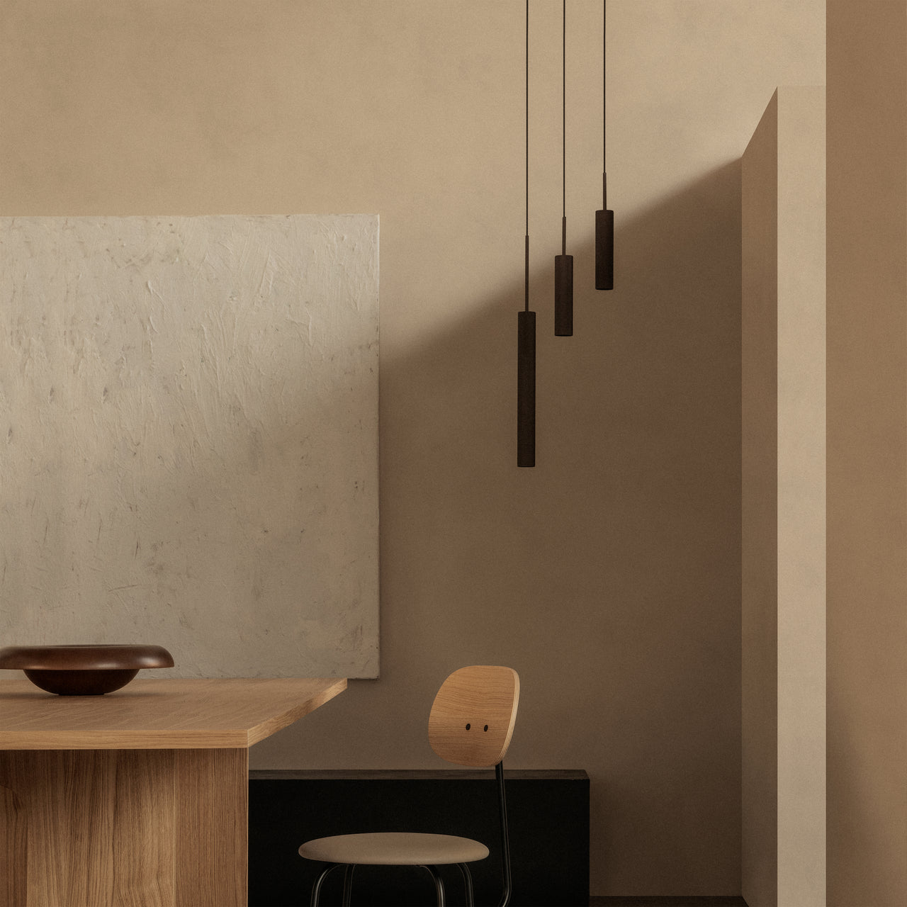 The Tubulaire Chandelier, designed by Krøyer-Sætter-Lassen, features multiple slim, cylindrical shades crafted from anodized aluminum with a bronzed brass finish. Its modular design includes options with 3, 6, 20, or 38 pendants, each arranged to emit focused downward light, making it ideal for larger spaces like dining areas or grand entryways. The reeded texture on each pendant adds a subtle tactile detail, balancing industrial character with Scandinavian simplicity.