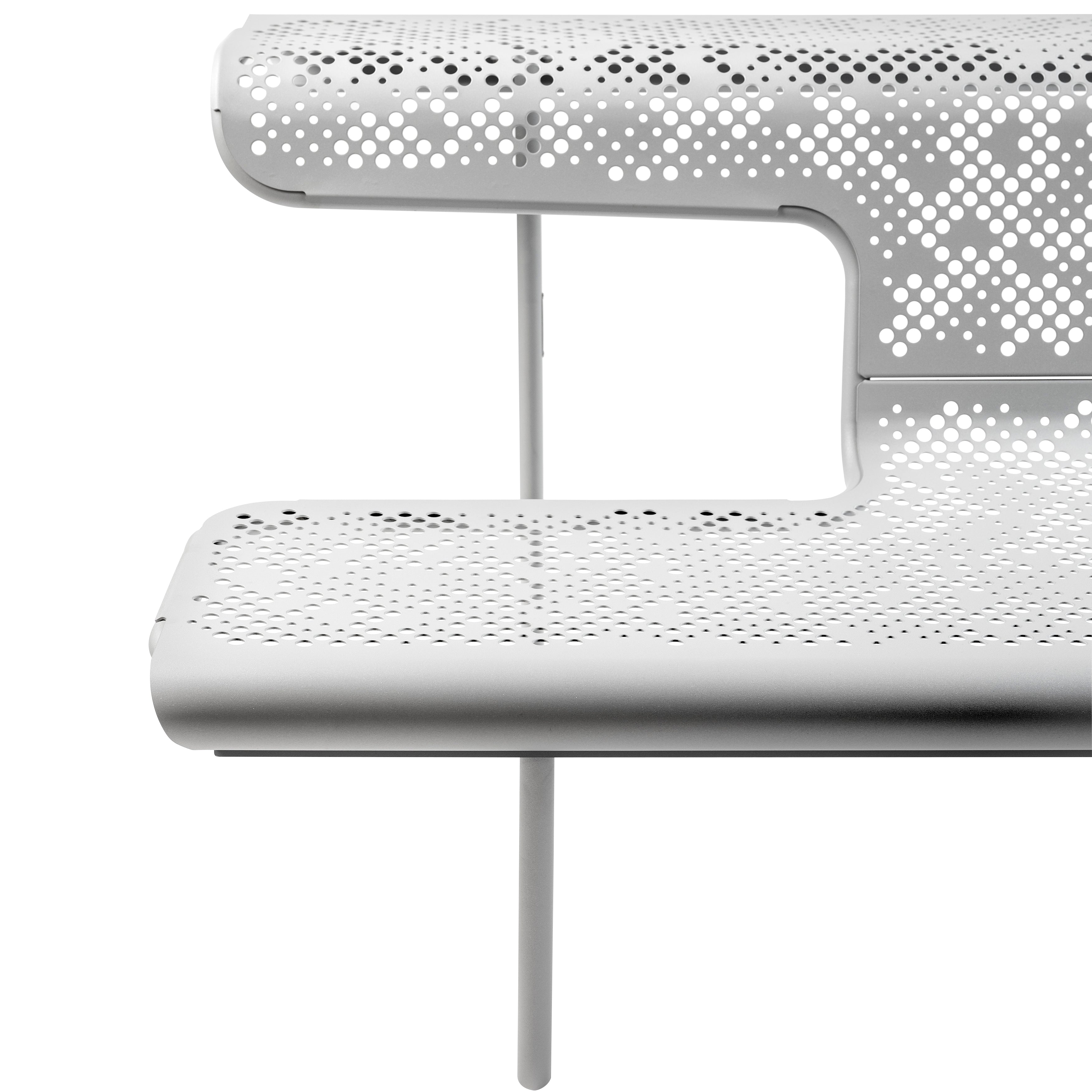 This steel bench is designed for use in both public and private settings, with a perforated seat that promotes airflow and allows water to drain efficiently. The raised, angled backrest also functions as a convenient surface for writing or casual dining. Finished in bronze or textured silver, the bench can be securely fixed to the ground for added stability. Tubular supports and carefully placed perforations enhance both structure and comfort, contributing to its thoughtful, durable design.