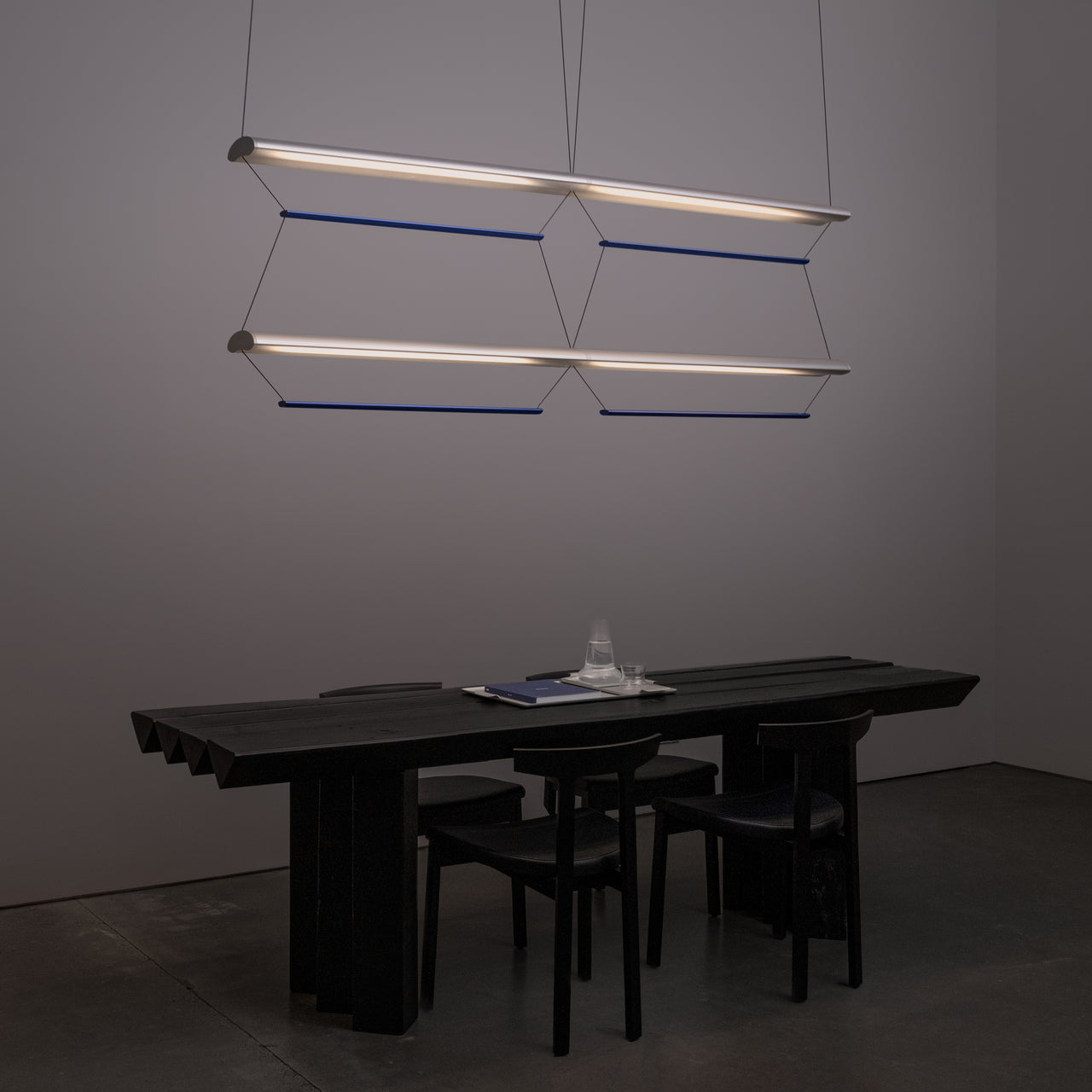 A scalloped aluminum reflector paired with a concealed LED source defines the Tier 150 Pendant, dispersing soft, uniform illumination across its wide span. Measuring 150 cm in length, the pendant is crafted from anodized aluminum, offered in finishes such as silver, gold, and copper. Its acrylic lens is available in jewel-toned shades like sapphire, emerald, and amethyst, adding a subtle color element to the design. Compatible with Phase, 0–10V, and DALI dimming systems.