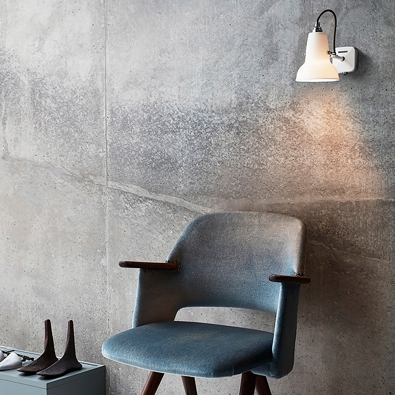 With a milky bone-china shade that turns translucent when the light is on, this wall version of 1227 Mini offers directional, soft illumination. Atmospheric it may be, but it’s also fully functional with the flexible shade that can be adjusted to cast light precisely where it is needed. The die-cast sconce is easy to mount and simple to use via Anglepoise’s integrated switch and makes a handsome addition with the glossy smoothness of the shade complemented by polished chrome-plated fittings.