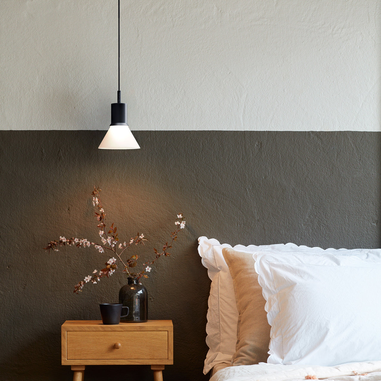 The Type 80 Pendant by Anglepoise showcases a conical shade with an opal glass diffuser, delivering both ambient and direct light. A distinctive 'halo' light escape at the top of the shade adds visual interest. Finished in matte black. The pendant includes a clean ceiling rose and an integrated LED bulb.