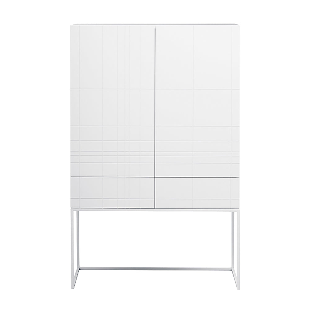 Swedish maker Asplund adds a vertically oriented cabinet to its striking Kilt Light series by Claesson Koivisto Rune. Concealing generous storage behind 2 doors, 90 also adds 2 side-by-side drawers at the bottom. Expressly made in Sweden, the lacquered MDF unit is available in a range of Nordic hues with a geometric pattern that riffs on a classic tartan. The powder-coated metal base is available either to match or in a contrasting color.