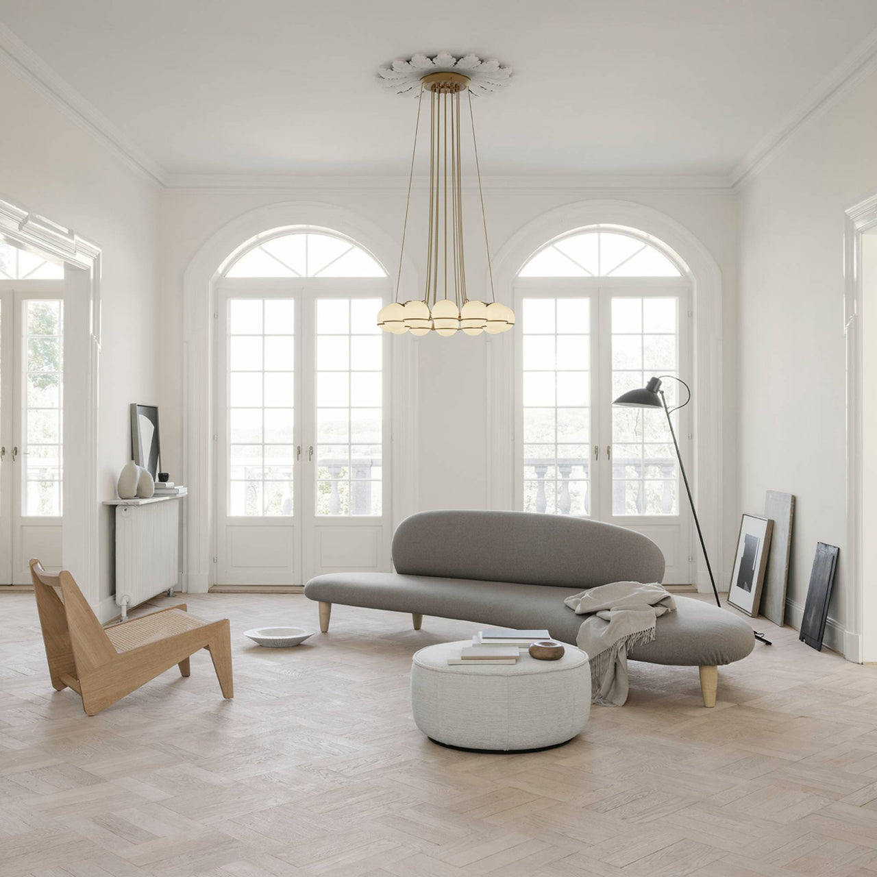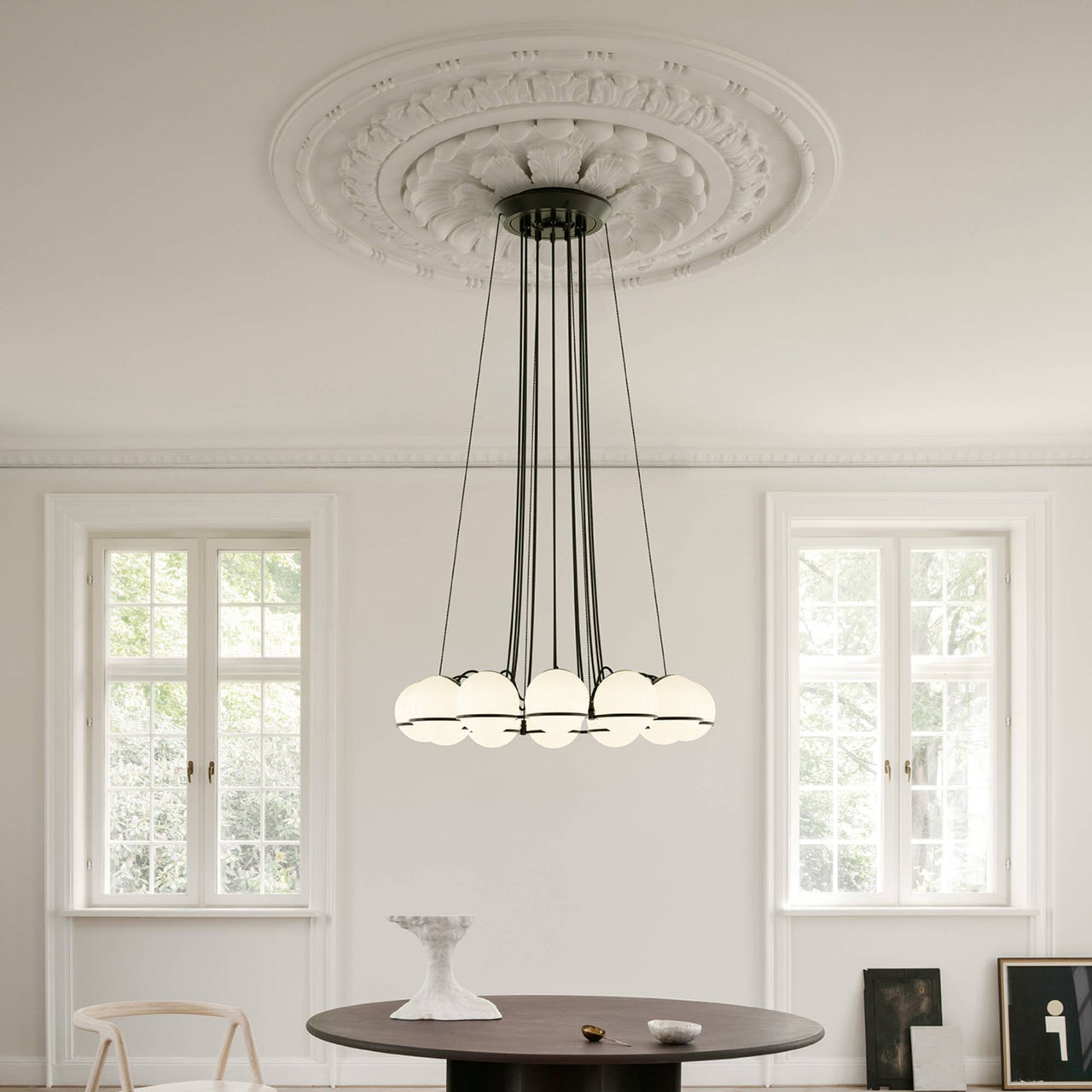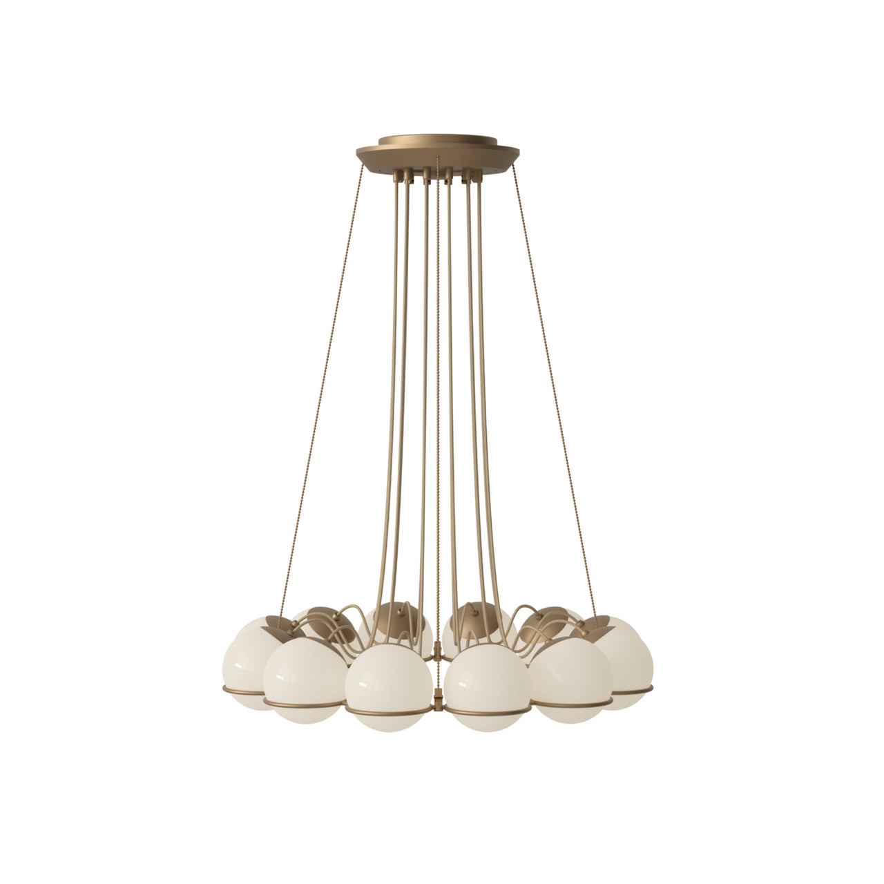 Midcentury lighting master Gino Sarfatti took inspiration from the moon itself for his 1959 chandelier Le Sfere. A soaring armature suspends the circle of the mouth-brown opaline glass spheres held in place by individual aluminum rings with the lyrical framework offered in a choice of graphic black or gilded champagne finish. Astep, founded in Copenhagen by Sarfatti's grandson Allessandro, reissues Model 2019 in a choice of 16 large or small spheres or the breathtaking marvel of 24 small spheres, under license with its original producer Flos and handcrafted in Italy.