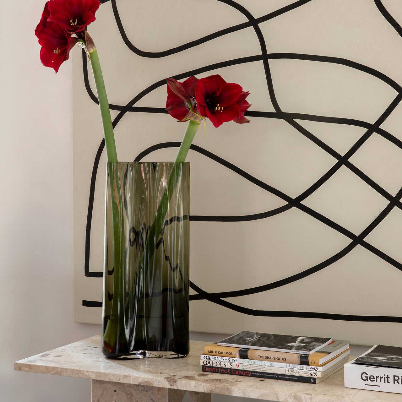 Inspired by the spiraling movement of air often seen in smoke or mist, Aer’s silhouette undulates in liquid-like waves, a lovely way to display flowers and branches or striking as a standalone sculpture. Taking its name from the Latin word for vapor, Gabriel Tan’s rippled vase is fashioned with molten glass that is mouth-blown into a mold to achieve the effect.