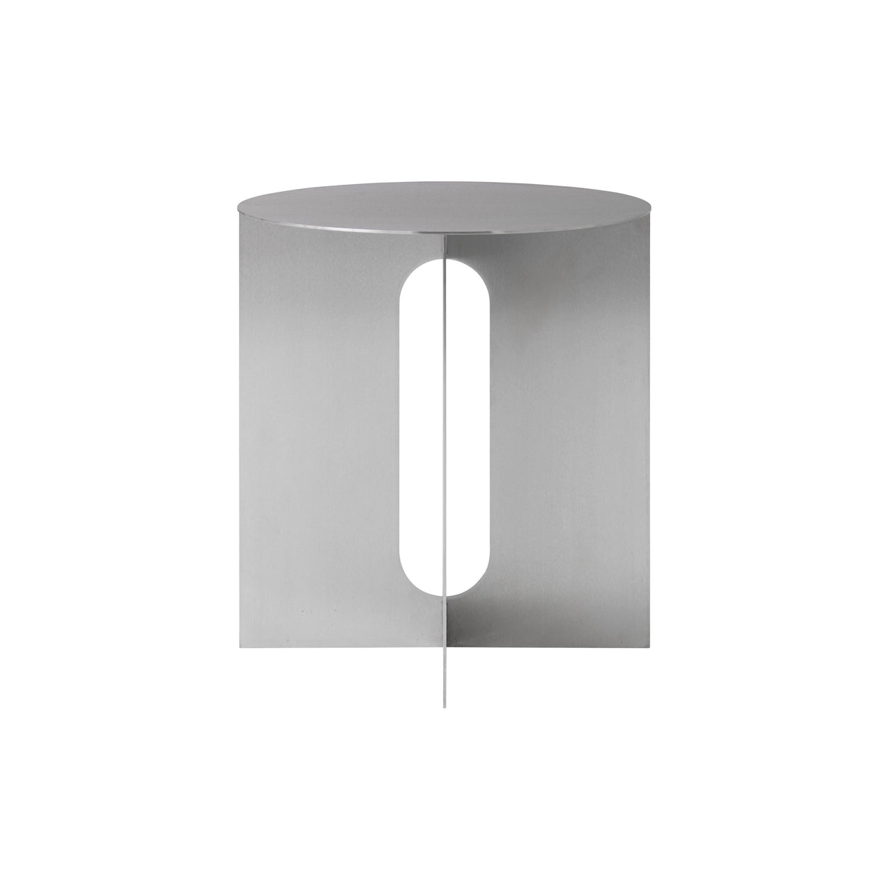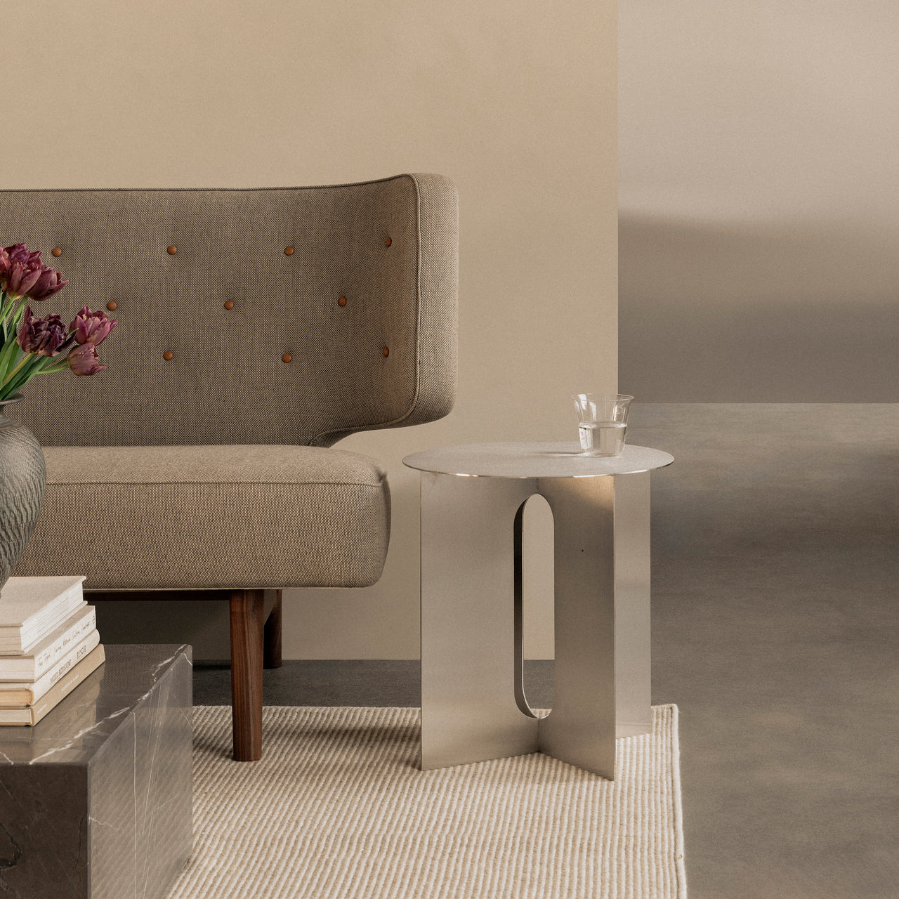 This steel version of the Androgyne Side Table is a sculptural piece blending contrasting design elements. Its powder-coated steel base, with wide, flat legs crafted for precision, supports a round tabletop that slightly overhangs, creating a sense of balance. Designed by Norwegian architect Danielle Siggerud, the table comes in black, ivory, and brushed steel finishes. It works well as a side table in living rooms, bedrooms, or lounge areas.