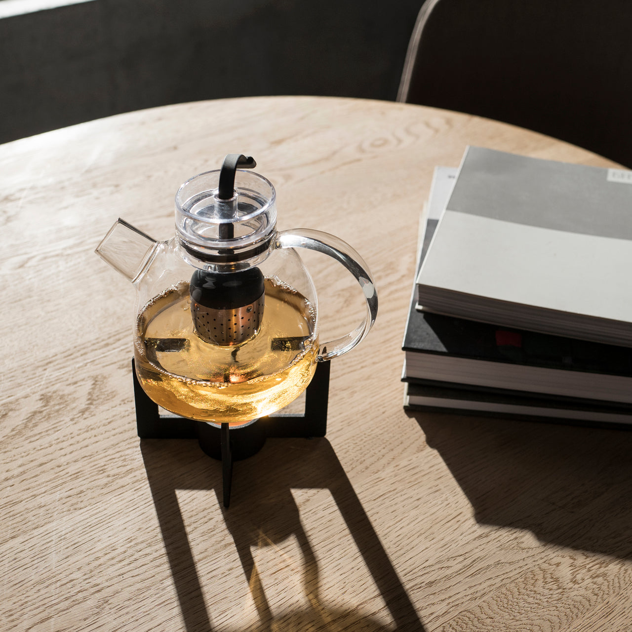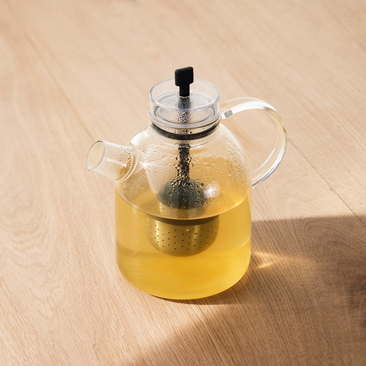 Eastern Zen meets Scandinavian modern in Kettle by Norm Architects, with its incorporated metal "egg" that infuses loose tea, saving the planet and money on tea bags. Simply plunge it into the glass pot for brewing and pull it up by the attached silicone string to remove for enjoying the brew.