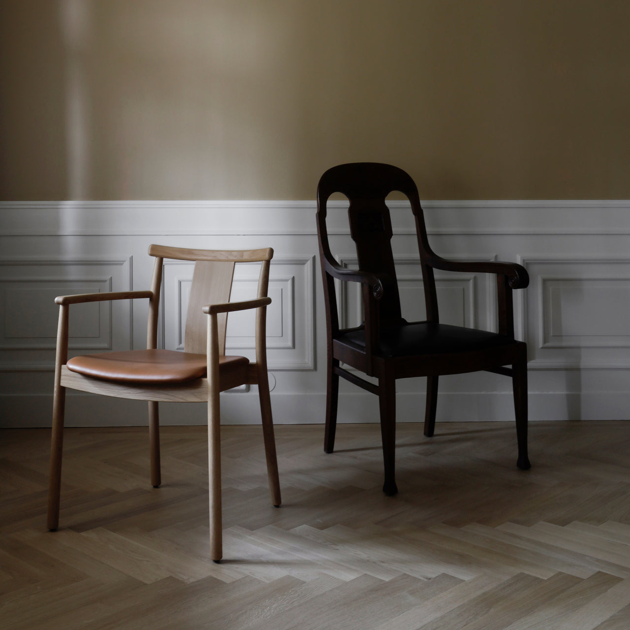 First designed by designers Skogstad & Wærnes for the historic Oslo Stock Exchange and named after the Roman god of trade, Merkur is an updated take on the archetypal dining chair. In versions both with and without armrests, this upholstered, solid-oak seating marries traditional craftsmanship and a timeless form.