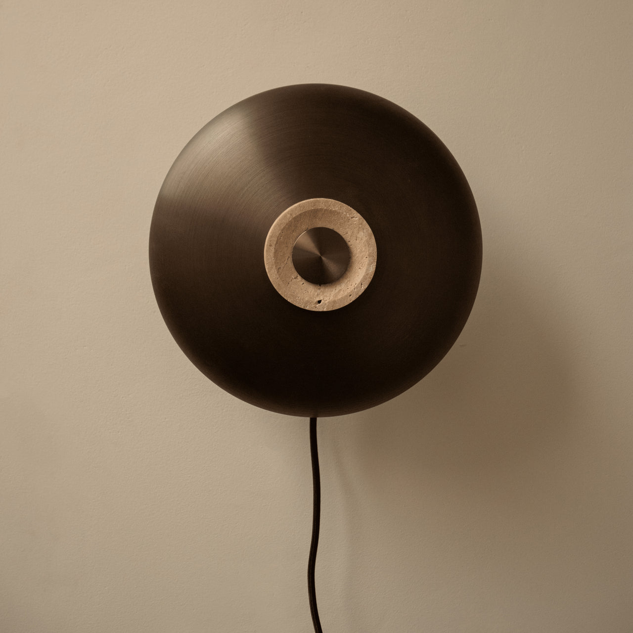 The Reverse Wall Lamp features a conical travertine base that showcases the stone's natural texture, paired with a curved bronzed aluminum shade for contrast. An opal diffuser provides soft, ambient illumination. This fixture is available in hardwire or plug-in and includes a rotary dimmer and is compatible with TRIAC dimmer systems.