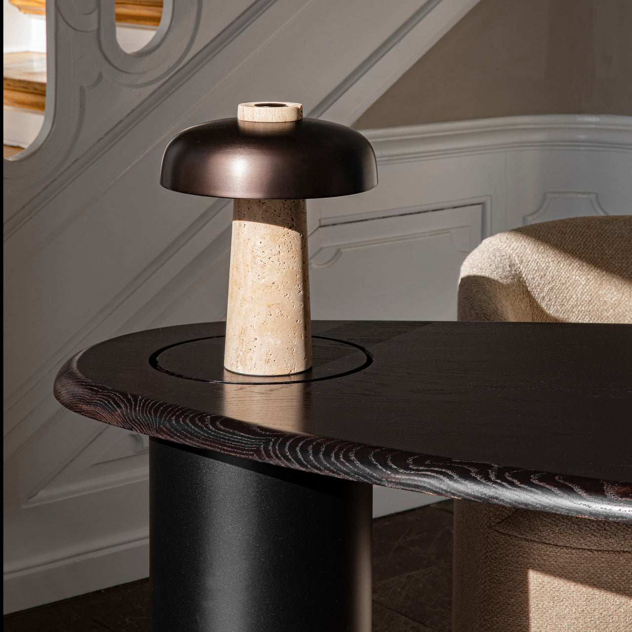 Named after the path of passing celestial bodies in the sky, Eclipse's oval breaks the mold of the usual desktop. Crafted in solid oak, the sweeping expanse is fitted with a lid that lifts to reveal a hidden storage bucket in the metal column leg, allowing the surface of UK designer Fred Rigby's desk to stay clutter-free whether it's placed in the middle of a room or up against a wall.