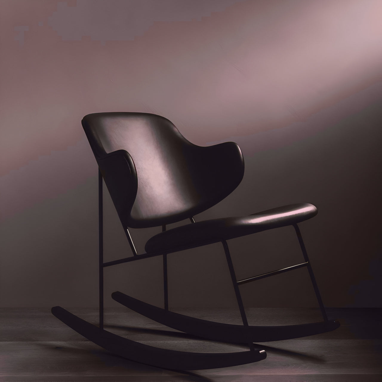 It features a curved back and seat, fully upholstered in fabric or leather, supported by a sturdy steel frame. The chair rests on wooden rockers, allowing for a gentle rocking motion. This piece reflects Kofod-Larsen's focus on user comfort and natural simplicity, making it suitable for various interior settings.