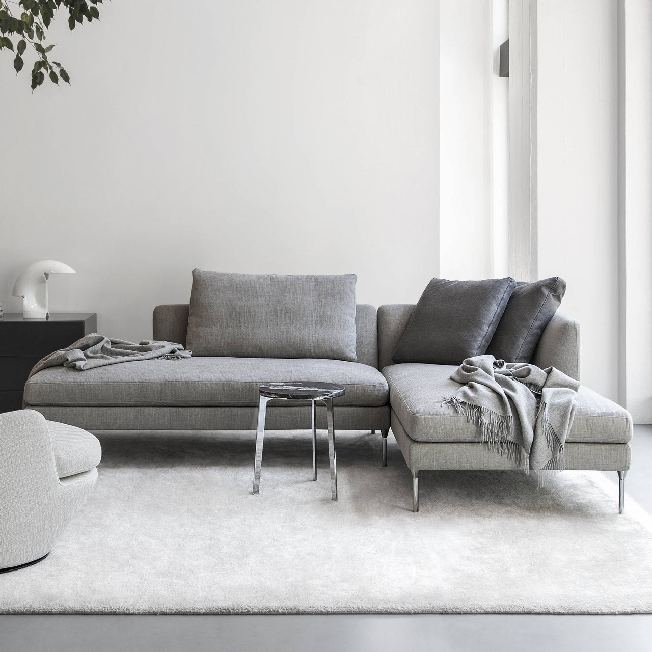 In varied sizes and orientations left or right-arm Bensen offers several versions of its Delta Sectional. Each one brings a fresh point of view and a modern attitude to upholstered seating, with smooth lines and plushy down-filled cushions. Sink-in comfort is created through the sofa's multi-layer seat cushioning on a webbed frame. Large back cushions can be arranged as desired and combined with smaller matching throw pillows. And the built-in steel frame with recessed legs allows the individual units to hug each other securely.