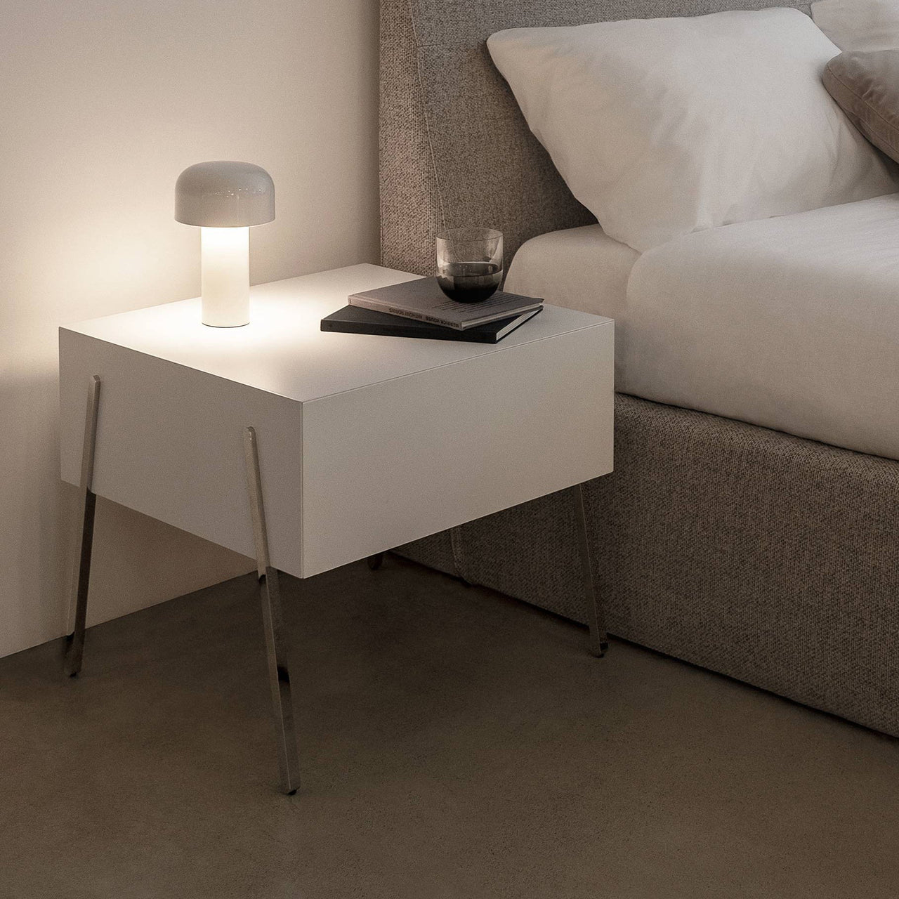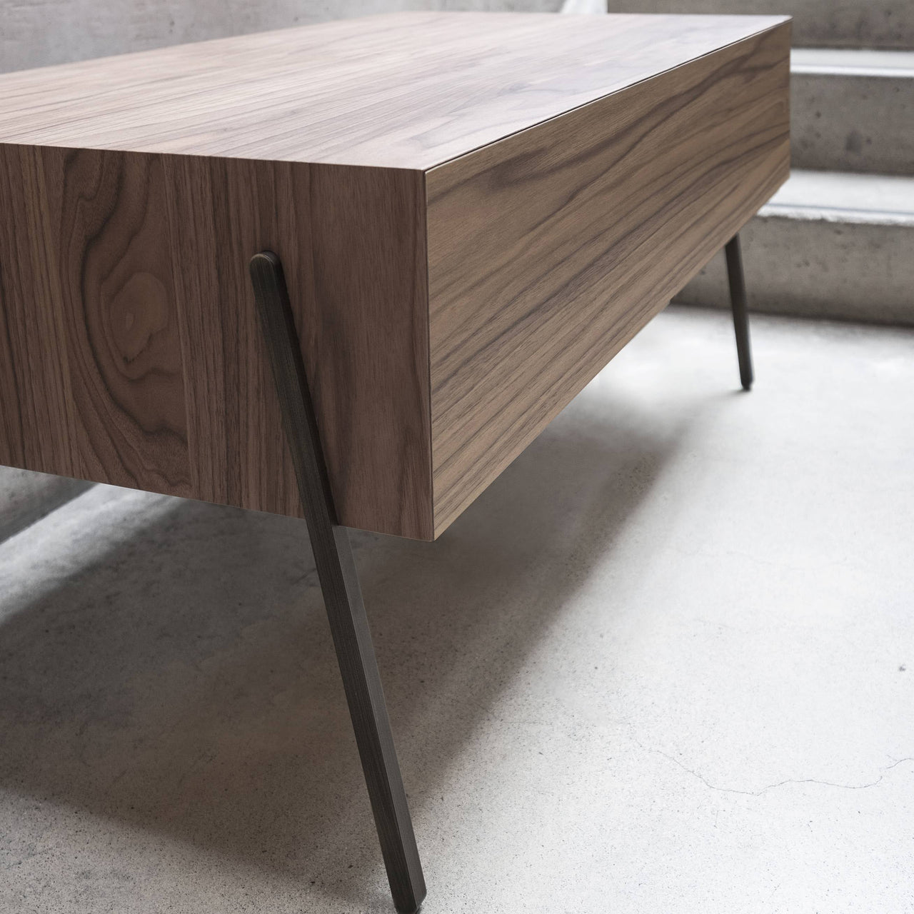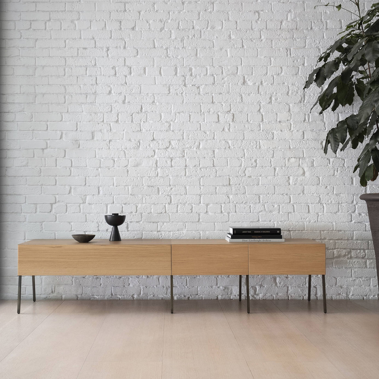 Elevated on slender metal legs, the geometric Into drawer cabinet floats serenely above the floor surface. Canadian-based Bensen’s superb made-in-Italy craftsmanship shines as the top woodgrain wraps around the sides for a continuous visual effect. Available in a variety of curated finishes, the cabinet comes in a choice of sizes—to use by the bed, as a side table or to combine as a larger storage setup.