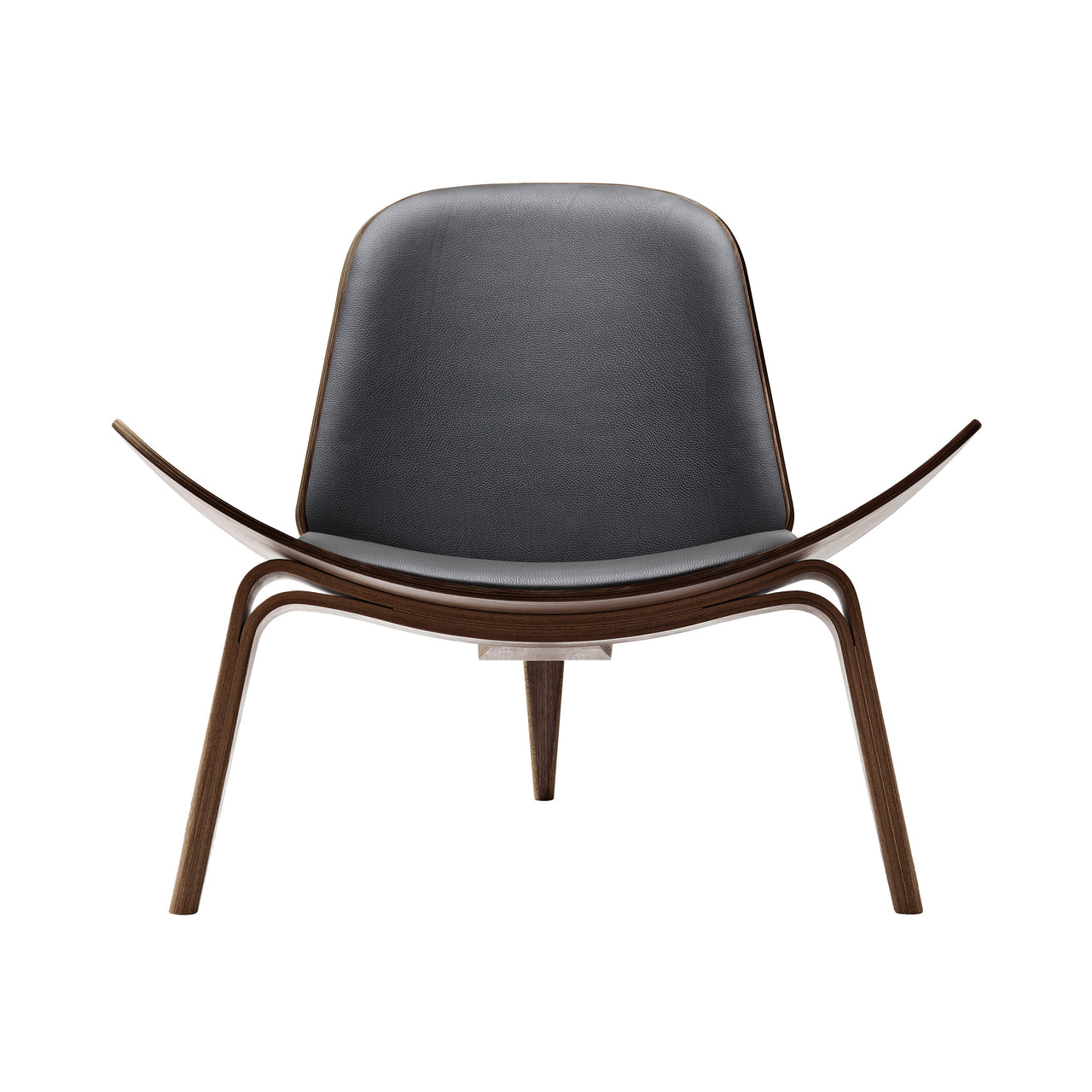 Hans J. Wegner's groundbreaking Shell Lounge Chair gets a version in rich oiled or lacquered walnut with premium textile or leather upholstery. Its winglike profile and distinctive curving tapered legs may have been ahead of their time in 1963 on its debut but its reissue in 1998 heralded a modernist icon. The comfort-inducing seat and back are made from highest quality, form-pressed hardwood laminates and the stable trio of front and back legs is each shaped in a single continuous length.