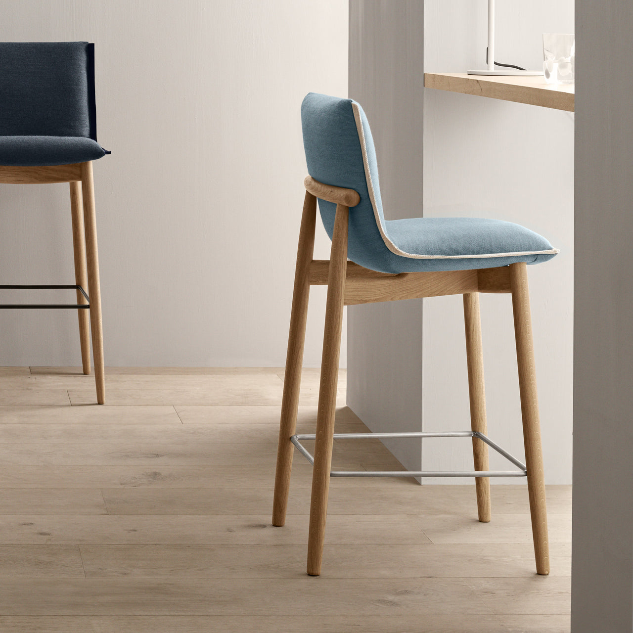 Bordered in a natural hue, the Embrace series adds a handsome counter stool with its signature folded-cushion seat that combines optimal comfort with an offhand elegance. Designed by Austrian studio EOOS for Carl Hansen & Søn, E007 is structured in solid oak or walnut with an array of available finishes and a brushed stainless steel footrest. Upholstery in a choice of a premium textile or buttery leather offers further customization to suit its intended surroundings.