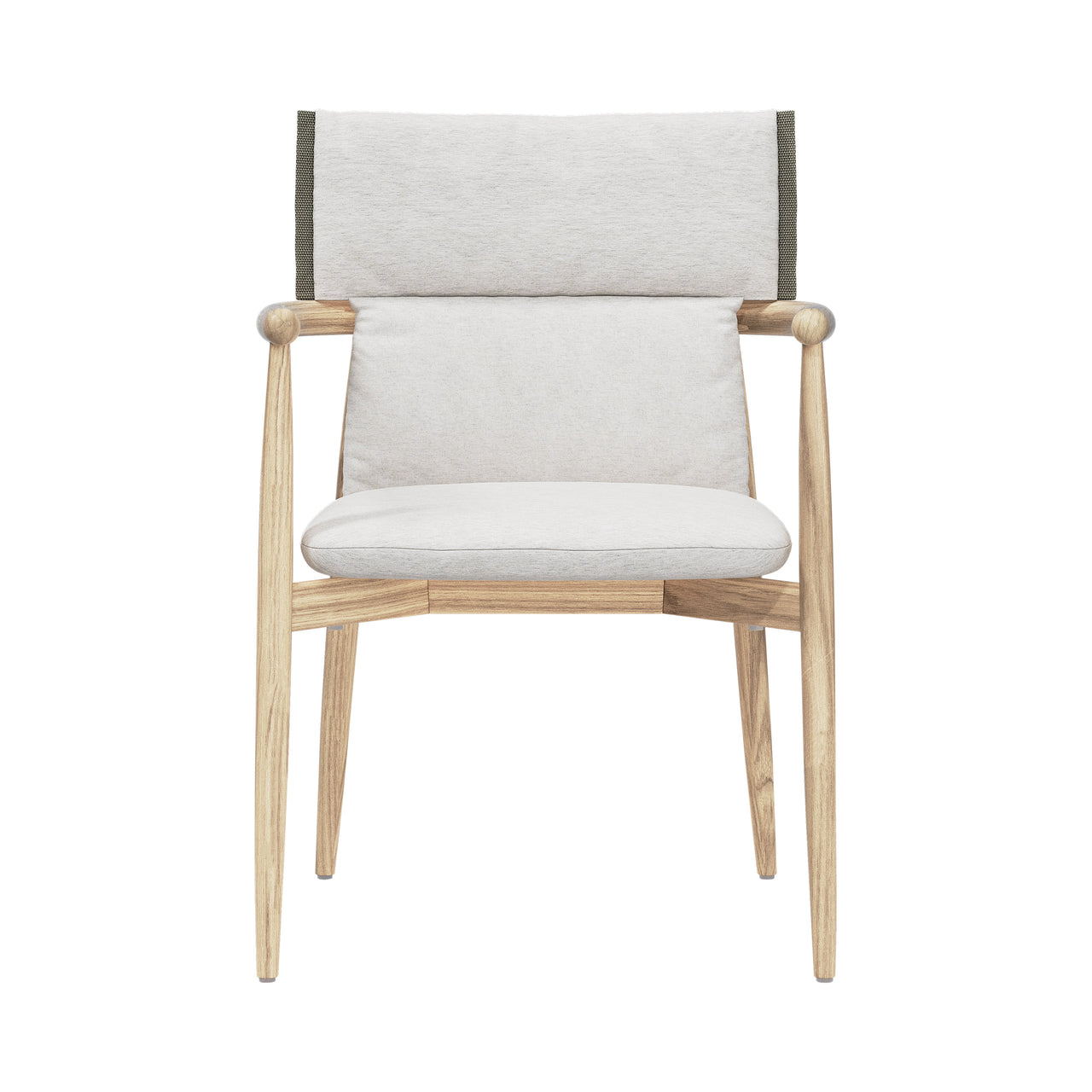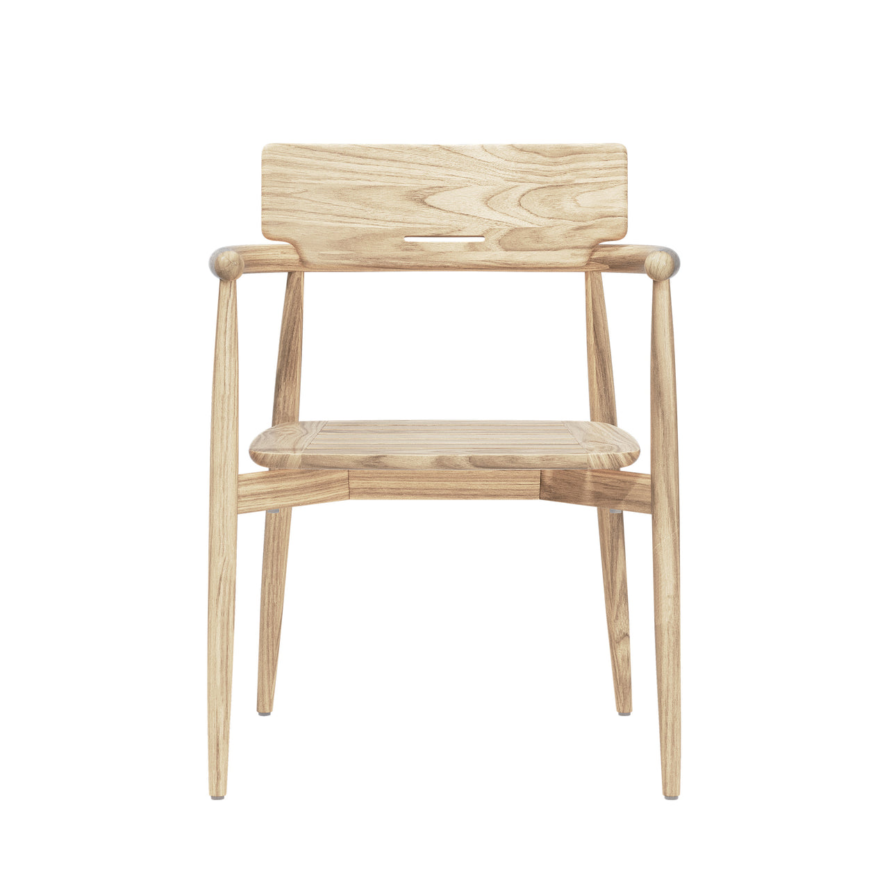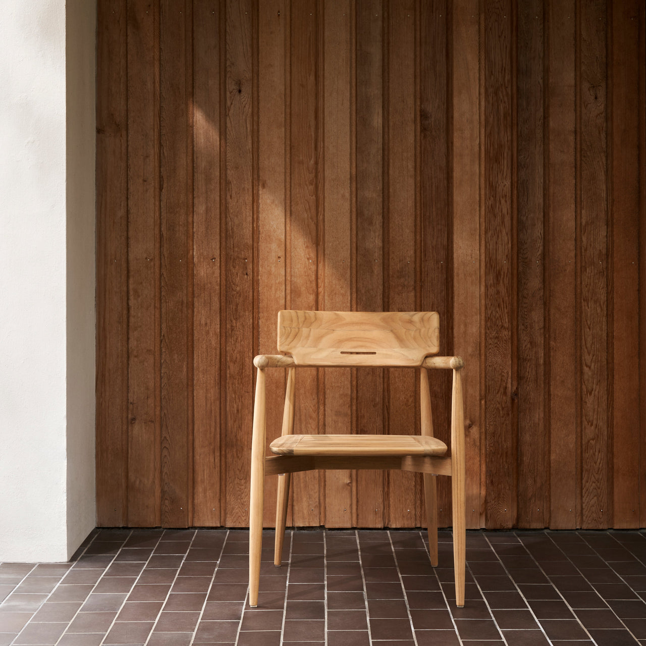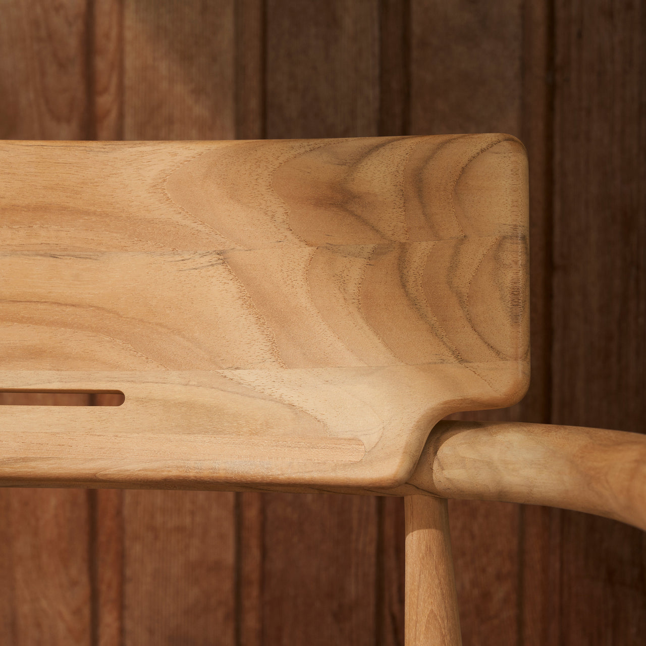 Design trio EOOS builds on its Embrace range for Carl Hansen with E008, an outdoor dining chair that echoes the silhouette of the series' original interior armchair. Crafted from untreated FSC-certified teak that develops a unique patina over time, the comfortable outdoor seating adds the option of a weather-resistant seat cushion. E008 can also be stacked for convenience.