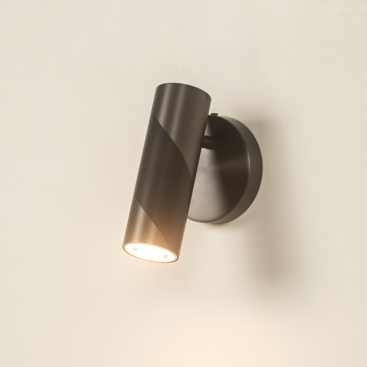 A lacquered spiral wraps around the tubular brass form, creating a playful contrast against its sleek silhouette. Precision-crafted in brass, the spotlight is available in satin brass, copper, graphite, and nickel finishes. It features an integrated 10W LED that emits 630 lumens at a warm 2700K, offering focused illumination with a bold and distinctive appearance.