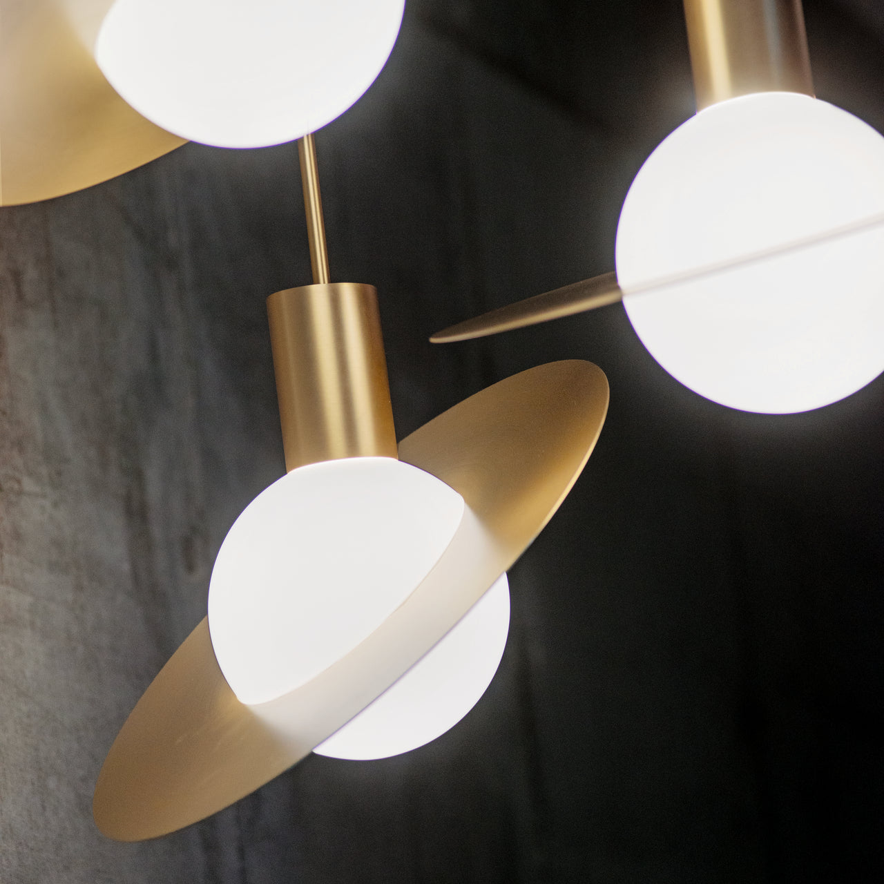 Whether lighting needs require a single “planet” or an entire galaxy, this luminous sphere creates its own cosmos. Designer Herve? Langlais posits a mouth-blown opal glass orb encircled with a solid-brass ring for Saturne, available in 2 sizes that each incorporate an appropriately sized LED light source. And for larger-scale installations, pendants can also be clustered from a single canopy in either a circular model in a range of standard sizes or a custom rectangular version.