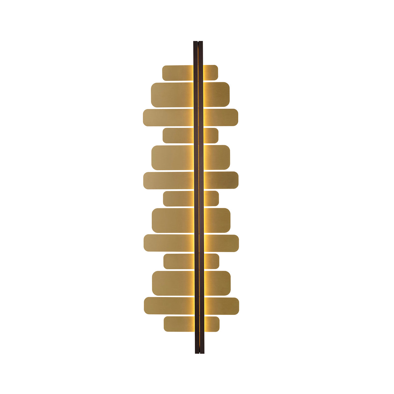A fabulous focal point in any setting, Strate takes form as a grouping of abstracted shapes linked by a luminous line. CVL’s Émilie Cathelineau tips between wall light and authentic sculpture with multiple stylistic variations of the piece, each to be oriented either vertically or horizontally. Warmly diffused illumination from the integrated LED is reflected in the solid-brass structure handcrafted in France with varied satin finishes of brass, graphite, nickel and copper.