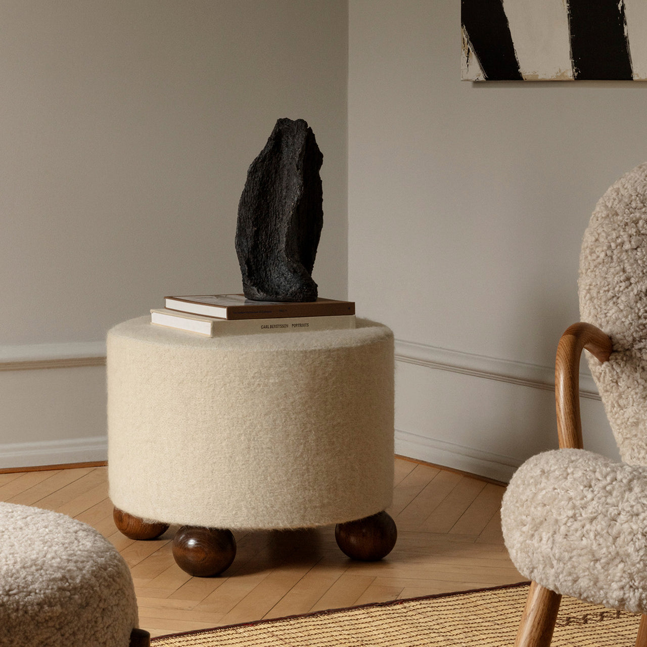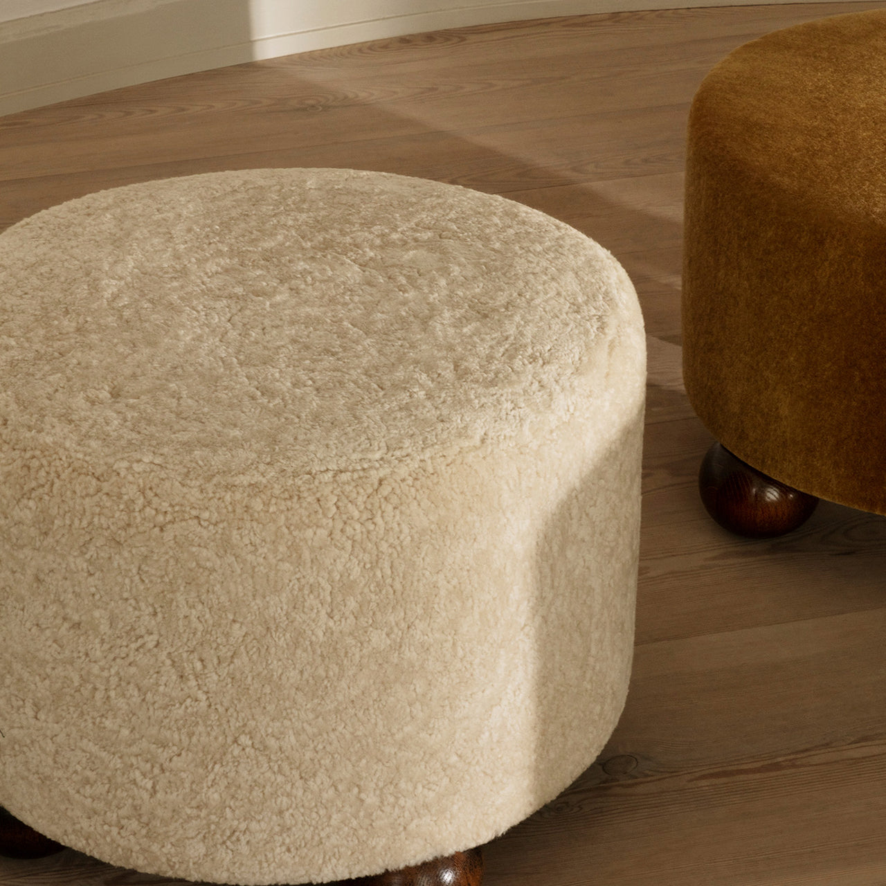 The Luupo Ottoman offers a versatile and stylish seating option with a round form resting on solid oak or walnut ball feet. It is upholstered in sheepskin or high-performance fabric. Constructed using traditional joinery methods, the frame is solid beech wood with foam cushioning. Its compact design makes it suitable as a footstool, side table, or extra seating.