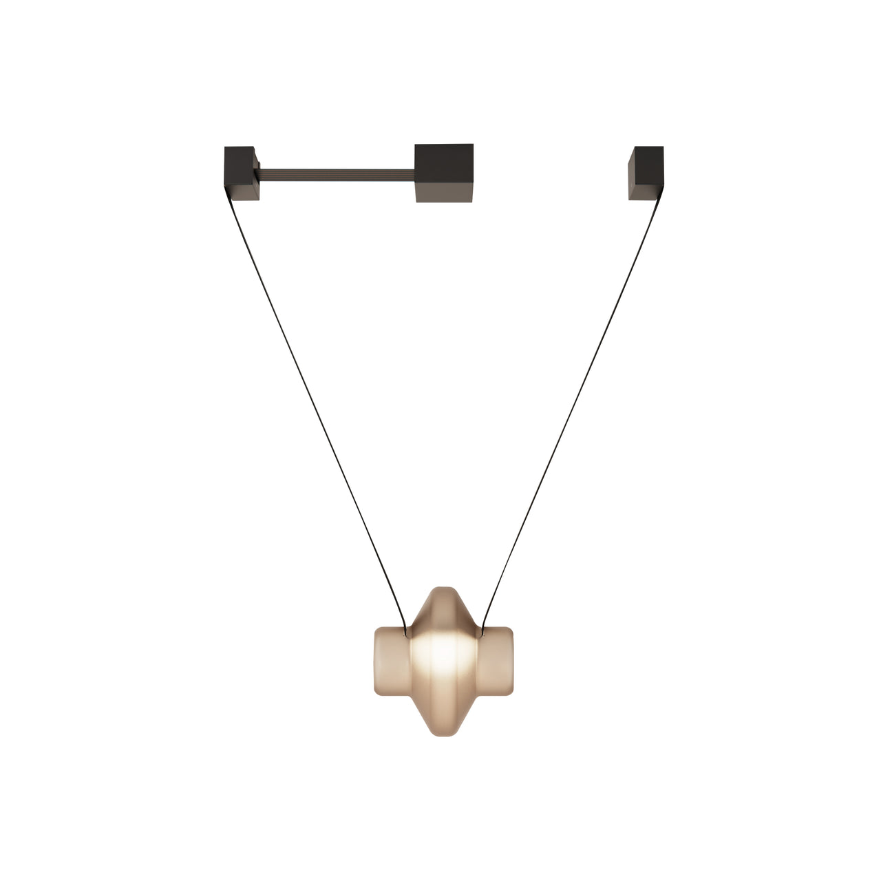 A contemporary lighting system inspired by scenic mountain landscapes and their reflections. It features a wide, flexible, conductive cable that supports and powers the light modules, allowing for versatile configurations. The cable is finished in matte black and designed for creating various geometric and tension-based setups. The lamp includes hand-blown glass globes available in transparent, pink, gray, and amber, with options for clear or frosted finishes. The anodized aluminum and frosted glass light module can direct light either downward or upward.