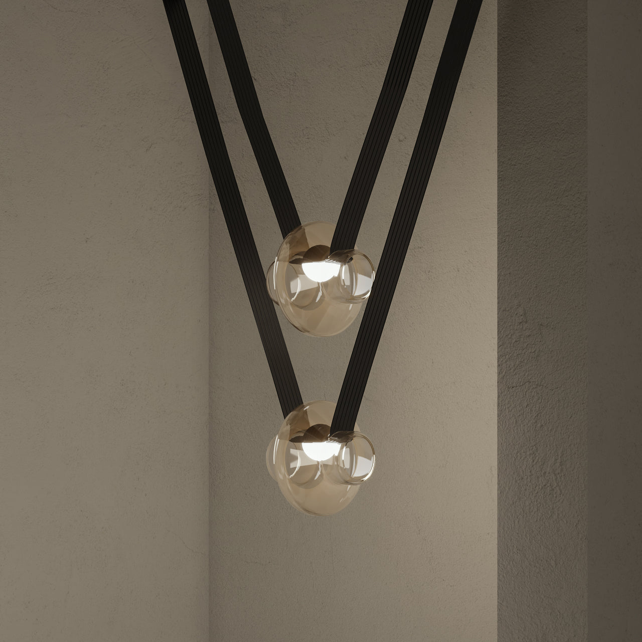 A contemporary lighting system inspired by scenic mountain landscapes and their reflections. It features a wide, flexible, conductive cable that supports and powers the light modules, allowing for versatile configurations. The cable is finished in matte black and designed for creating various geometric and tension-based setups. The lamp includes hand-blown glass globes available in transparent, pink, gray, and amber, with options for clear or frosted finishes. The anodized aluminum and frosted glass light module can direct light either downward or upward.