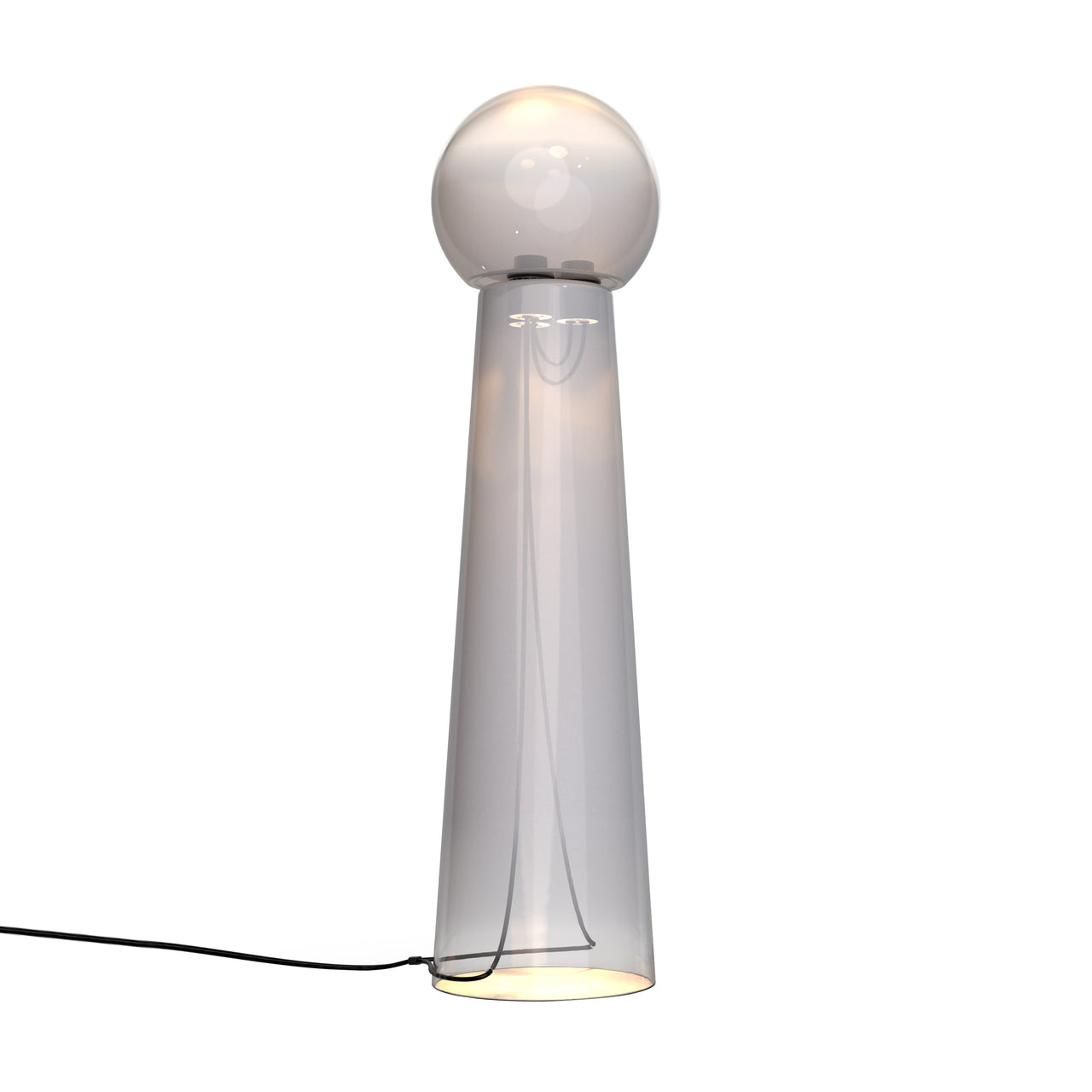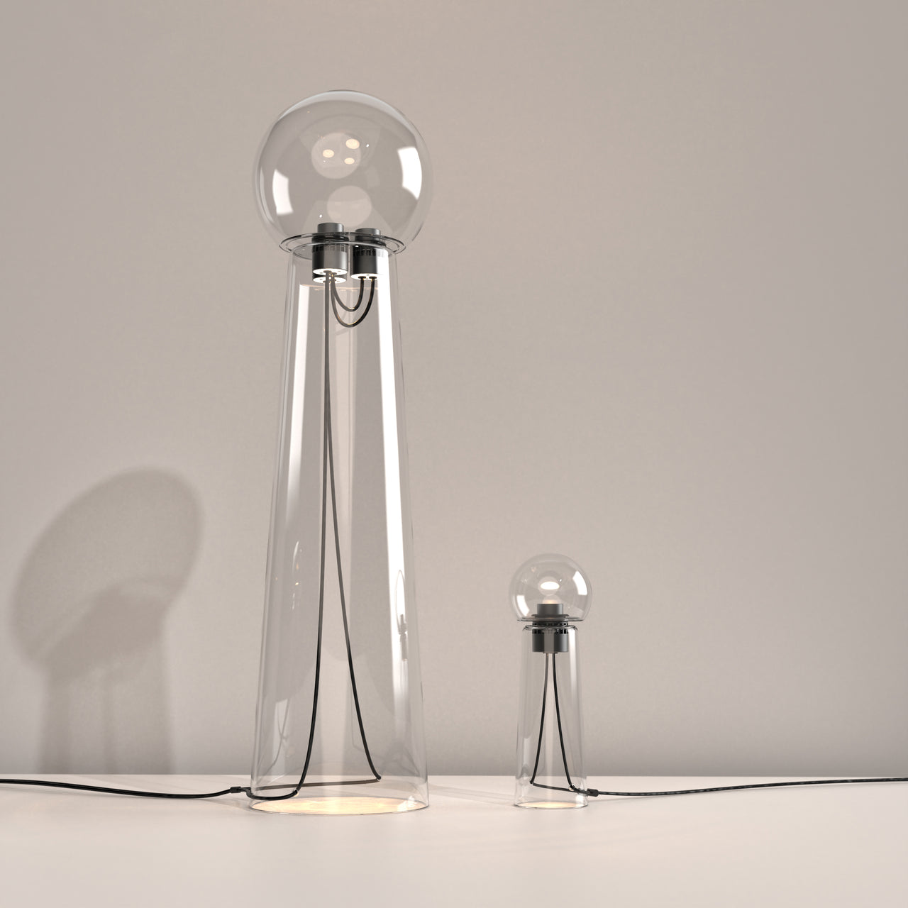 Created in collaboration with Verre d'Onge, this masterful blend of glass and light pushes the glassblowers art to the max. Its elegant geometry features a unique two-toned fade between opaque and transparent glass, creating a floating effect. The lamp's upper diffuser refracts light from an integrated LED: It includes three high-quality bidirectional light engines with a high CRI and dim-to-warm functionality, ranging from 3000K to 2200K. The Gigi Grande also features an integrated touch dimmer switch.