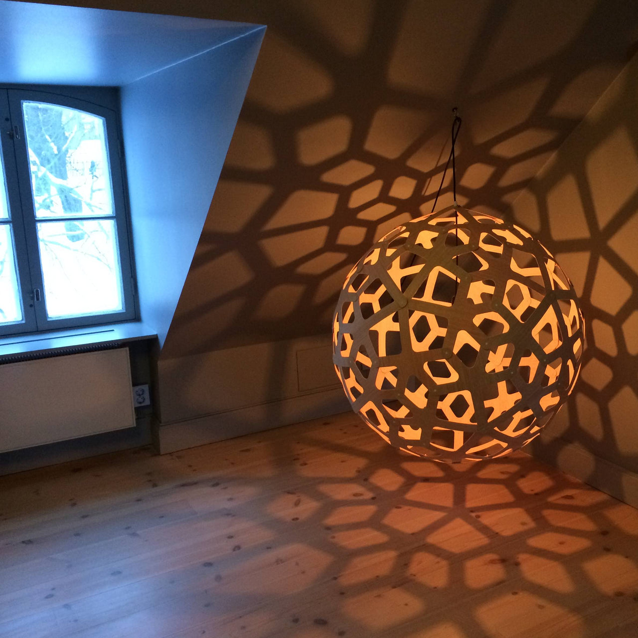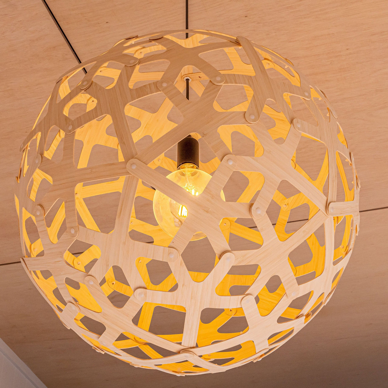 The "fingers" of the geometric polyhedron structure of this lamp are reminiscent of the coral reefs David Trubridge explores off the coast of New Zealand. A love for earth drove the construction, flatpacked to reduce freight and packing resources. Identical pieces make home assembly a snap. The celebrated designing craftsman ended up in his adopted home after he, his wife and their two sons sold everything and set off on a yacht for a world adventure. It culminated in 1985 when they decided to remain there. While an artist-in-residence at Hawkes Bay Polytechnic (now EIT), he built a house and suddenly found himself with further commissions. Before realizing homes, lamps and furniture, David left Newcastle University in 1972 with a degree in Naval architecture. His work has appeared in countless museums, including the Victoria & Albert and the Pompidou Centre. That barely scratches the surface of his fascinating story and work ethos.