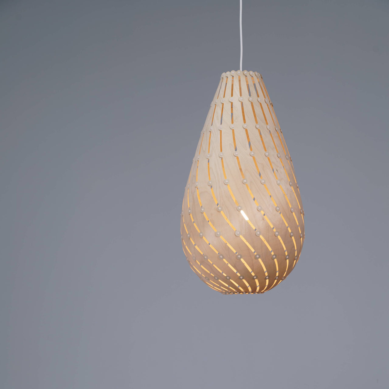 Longtime environmentalist designer David Trubridge adds a teardrop shade to his Ebb pendant series, with the characteristic swirl pattern inspired by ocean ripples. Now reworked in more sustainable ultra-thin Finnish birch plywood and held together with nylon clips, Drop has a lantern-like glow that also complements the natural woodgrain. It's even shipped in eco-friendly packaging as an easily assembled "kitset," complete with a cord-bulb holder and a ceiling canopy.