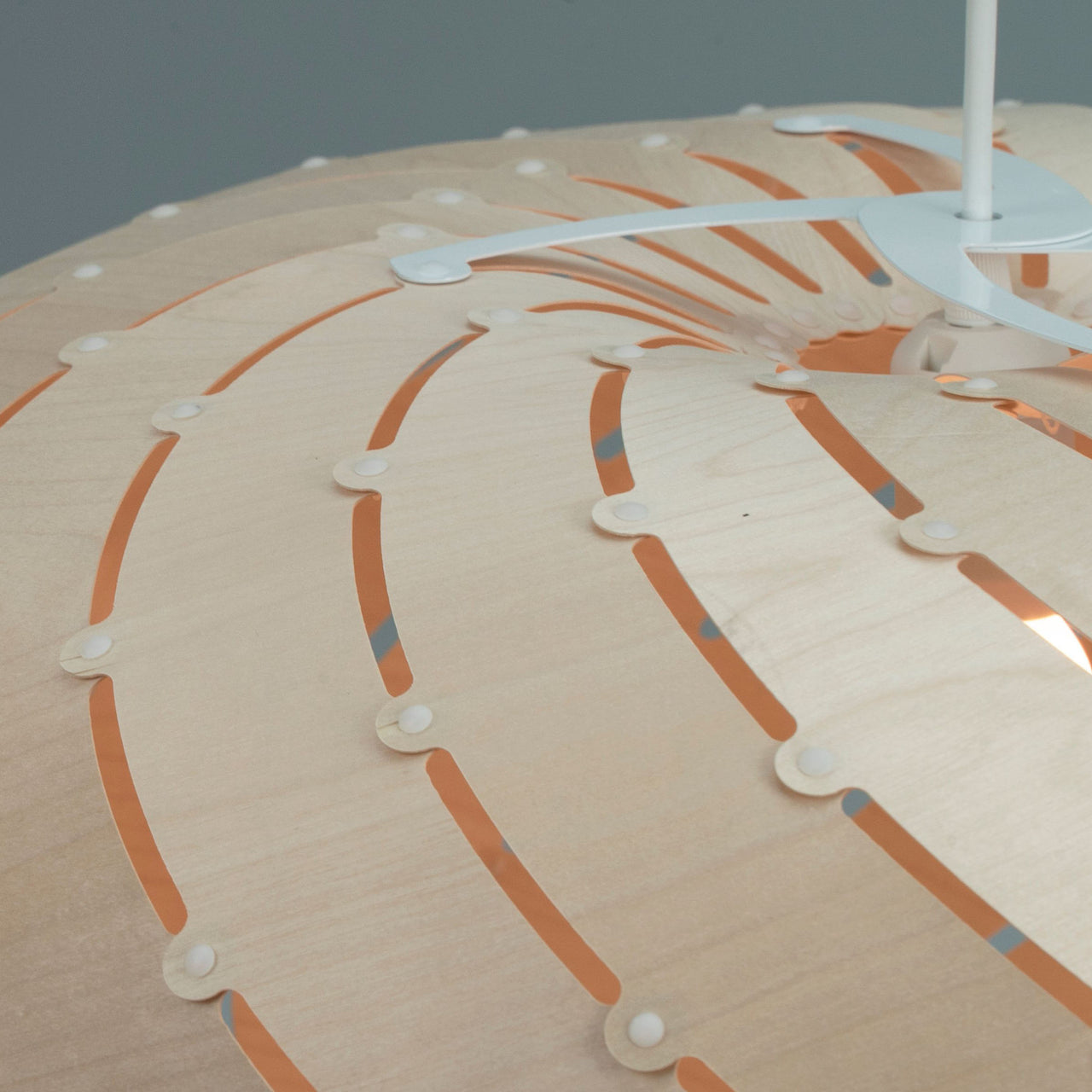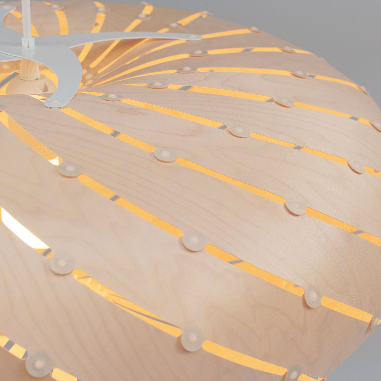 Swell adds a rounded disc shape to David Trubridge's pendant series Ebb, with its wavy swirl suggested by ripples in the water. Newly redesigned in more sustainable ultra-thin Finnish birch plywood and held together with nylon clips, it emits a glowing lantern effect which also highlights the natural woodgrain. Shipped as an unassembled flat "kitset" in environmentally friendly packaging, the shade comes complete with a cord-bulb holder and a ceiling canopy.