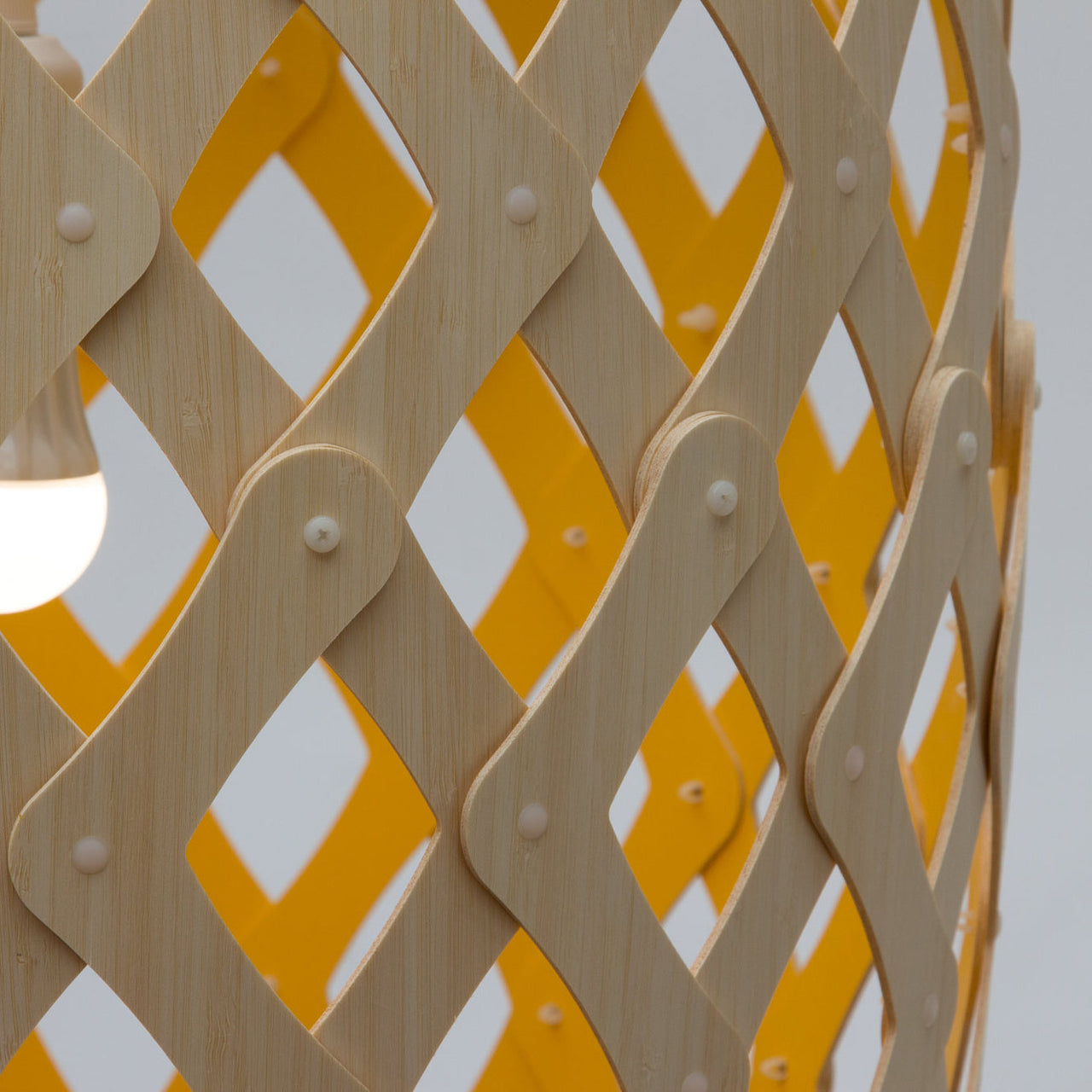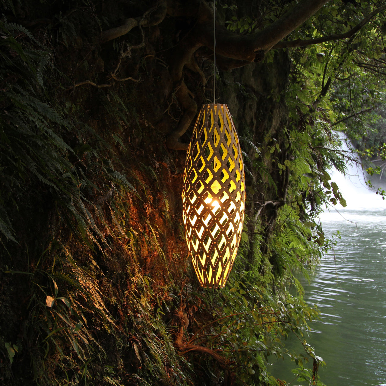 The first lamp New Zealand designer David Trubridge ever made in 1995 was shaped like a hinaki, the eel traps the Maori make from woven vines. The elongated form of the Hinaki Pendant Light equally captures attention in a foyer or room. A passion for the environment and earth drives the construction of all David's work, primarily made of renewable bamboo and flat-packed to reduce freighting and packaging resources and the identical pieces make home assembly a snap, literally. Endlessly adaptable, the light is available in 2 sizes and 9 stock colors (custom colors upon request) in natural or painted bamboo with nylon clip fasteners. The celebrated designing craftsman ended up in his adopted home of New Zealand after he, his wife and their two sons sold everything and set off on a yacht for a world adventure. It culminated in 1985 when they decided to remain there. While an artist-in-residence, he built a house and suddenly found himself with further commissions. Before realizing homes, lamps and furniture, David left Newcastle University in 1972 with a degree in Naval architecture. His work has appeared in countless museums, including the Victoria & Albert and the Pompidou Centre. That barely scratches the surface of his fascinating story and work ethos.