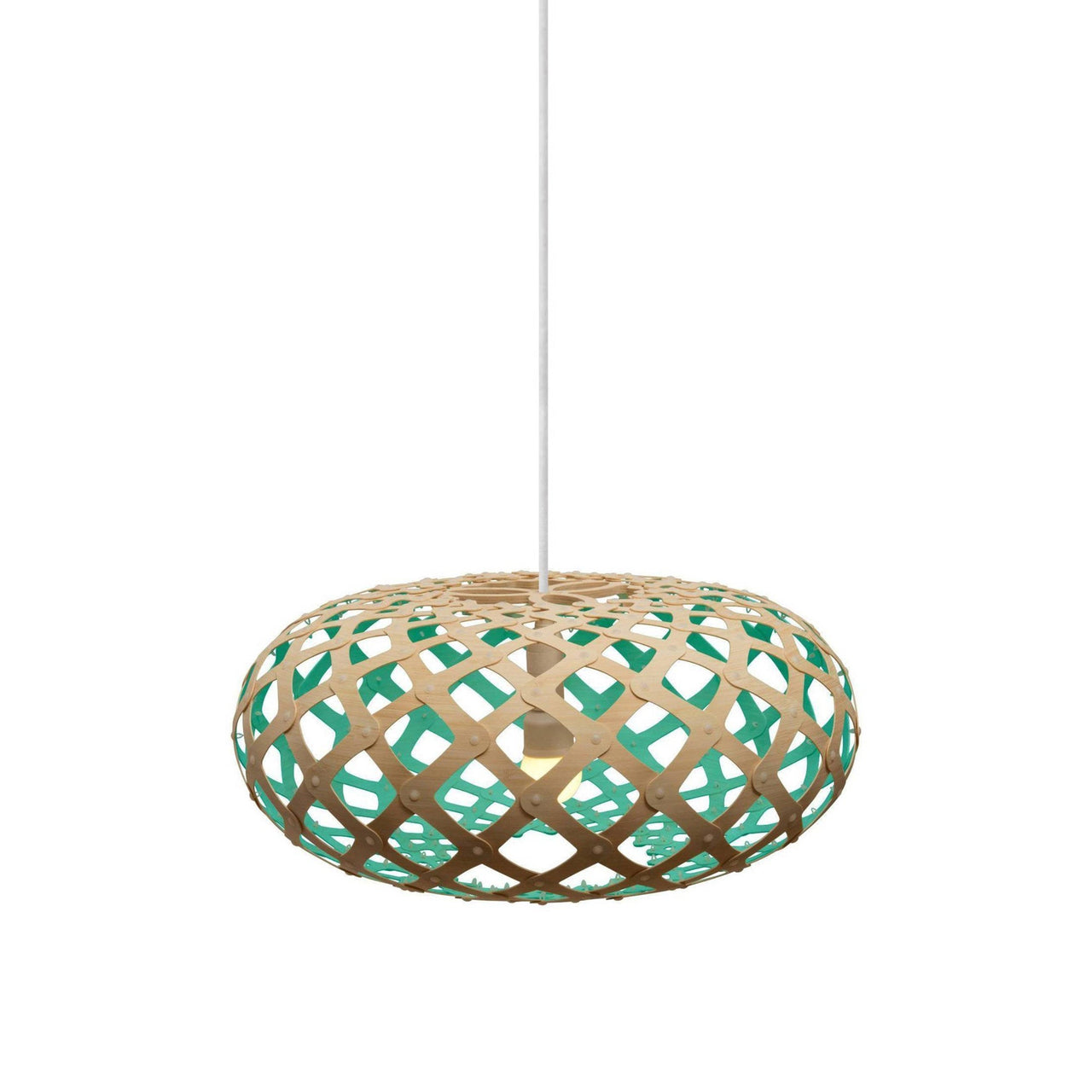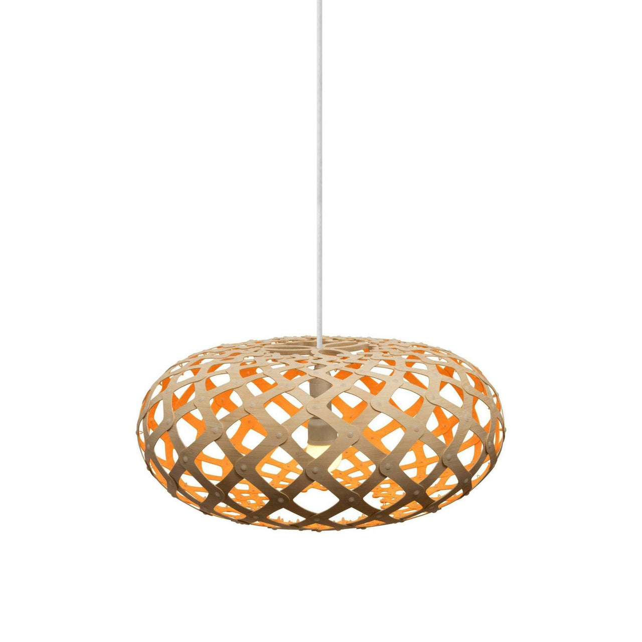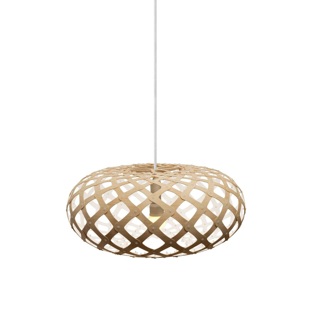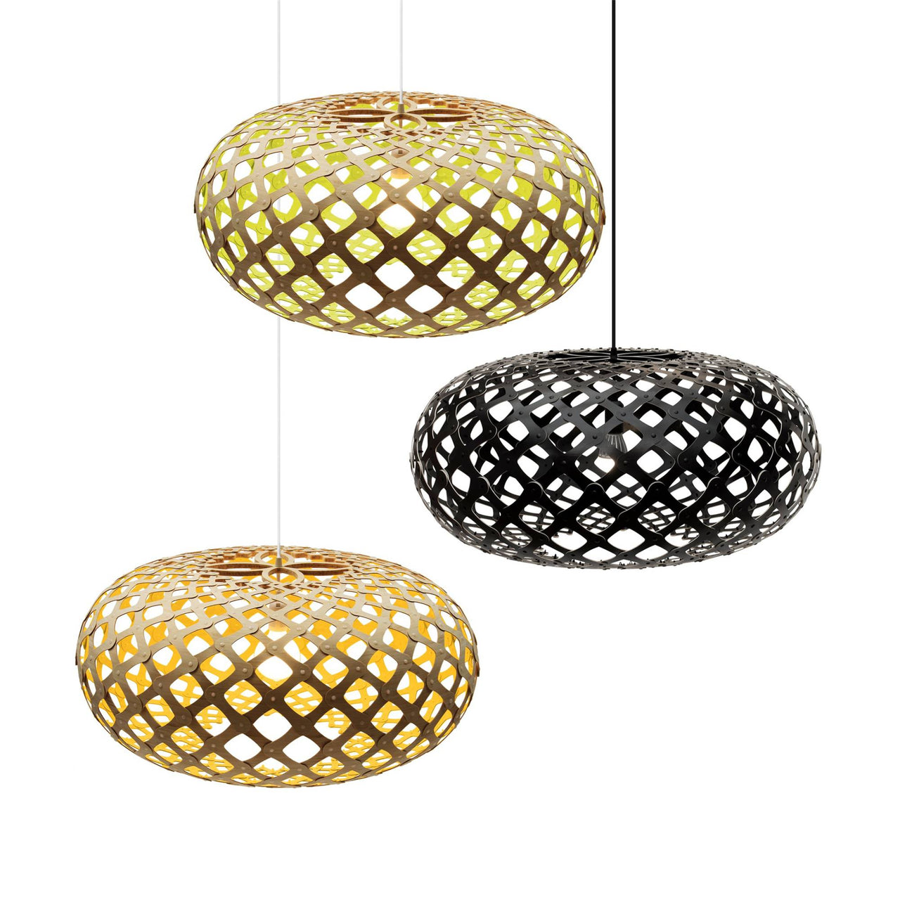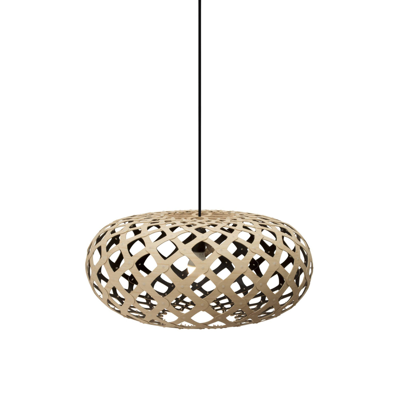 "An exquisite jewel," is how designer David Trubridge describes the kina, the Maori name for a tiny sea urchin native to the waters in the designer's adopted home of New Zealand. It also served as the form for his Kina Pendant Light. A passion for the environment and earth drives the construction of all David's work, primarily made of renewable bamboo and flat-packed to reduce freighting and packaging resources and the identical pieces make home assembly a snap, literally. Endlessly adaptable, the light is available in 2 sizes and 9 stock colors (custom colors upon request) in natural or painted bamboo with nylon clip fasteners. The celebrated designing craftsman ended up in his adopted home of New Zealand after he, his wife and their two sons sold everything and set off on a yacht for a world adventure. It culminated in 1985 when they decided to remain there. While an artist-in-residence, he built a house and suddenly found himself with further commissions. Before realizing homes, lamps and furniture, David left Newcastle University in 1972 with a degree in Naval architecture. His work has appeared in countless museums, including the Victoria & Albert and the Pompidou Centre. That barely scratches the surface of his fascinating story and work ethos.