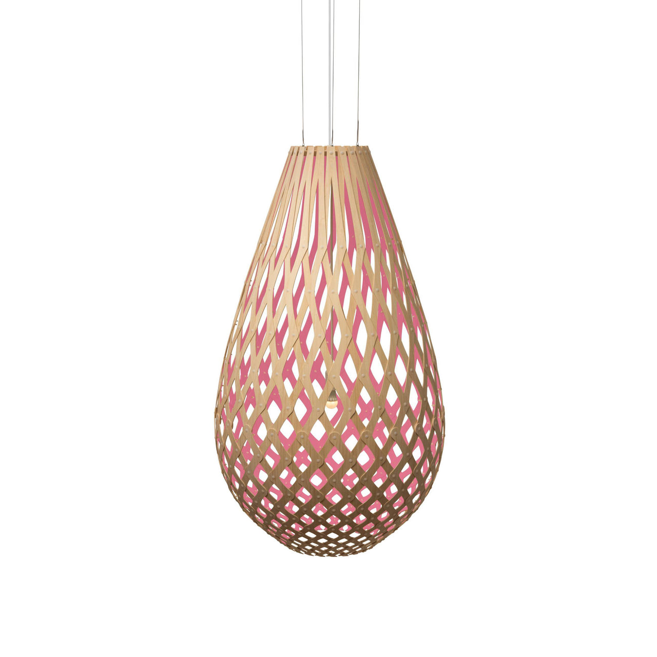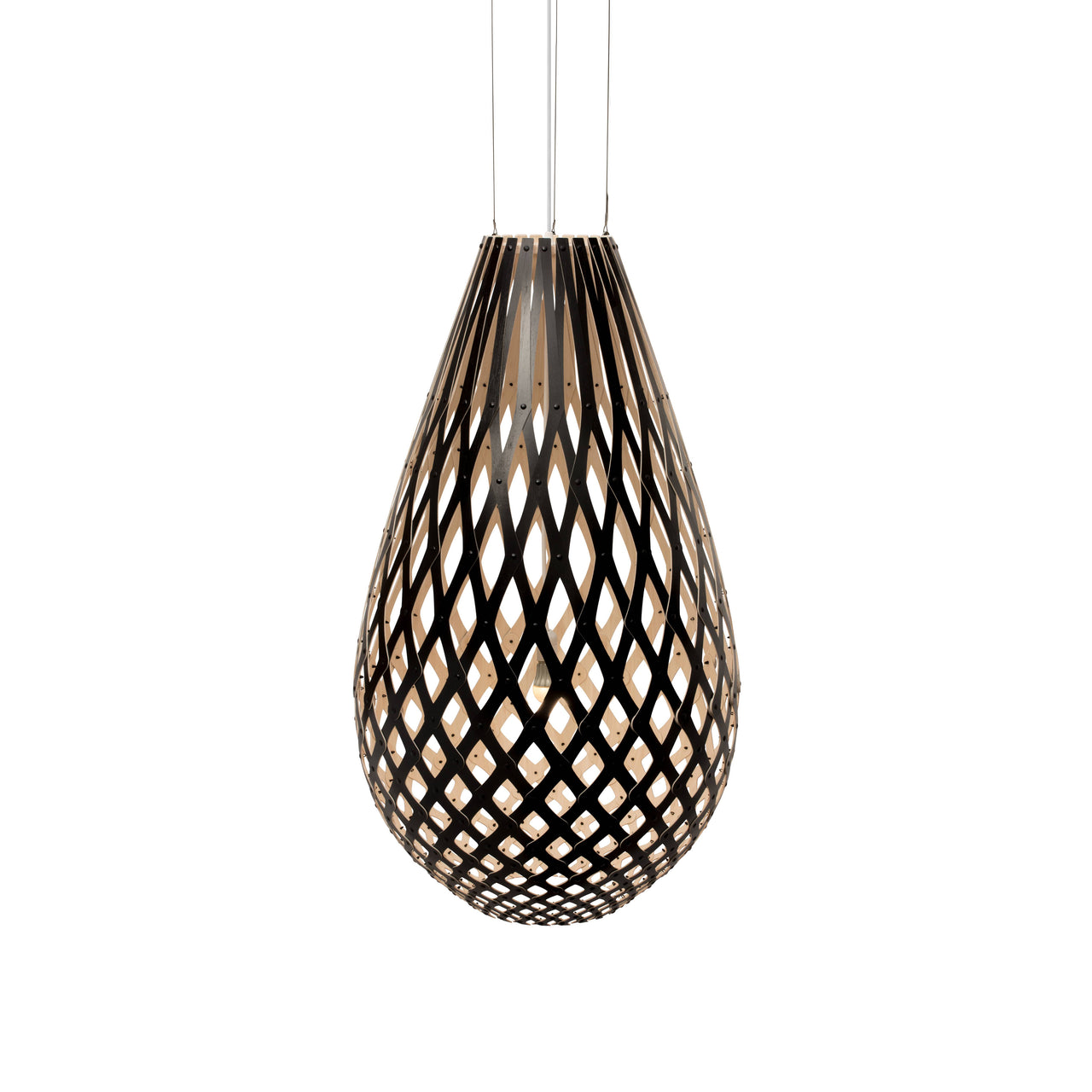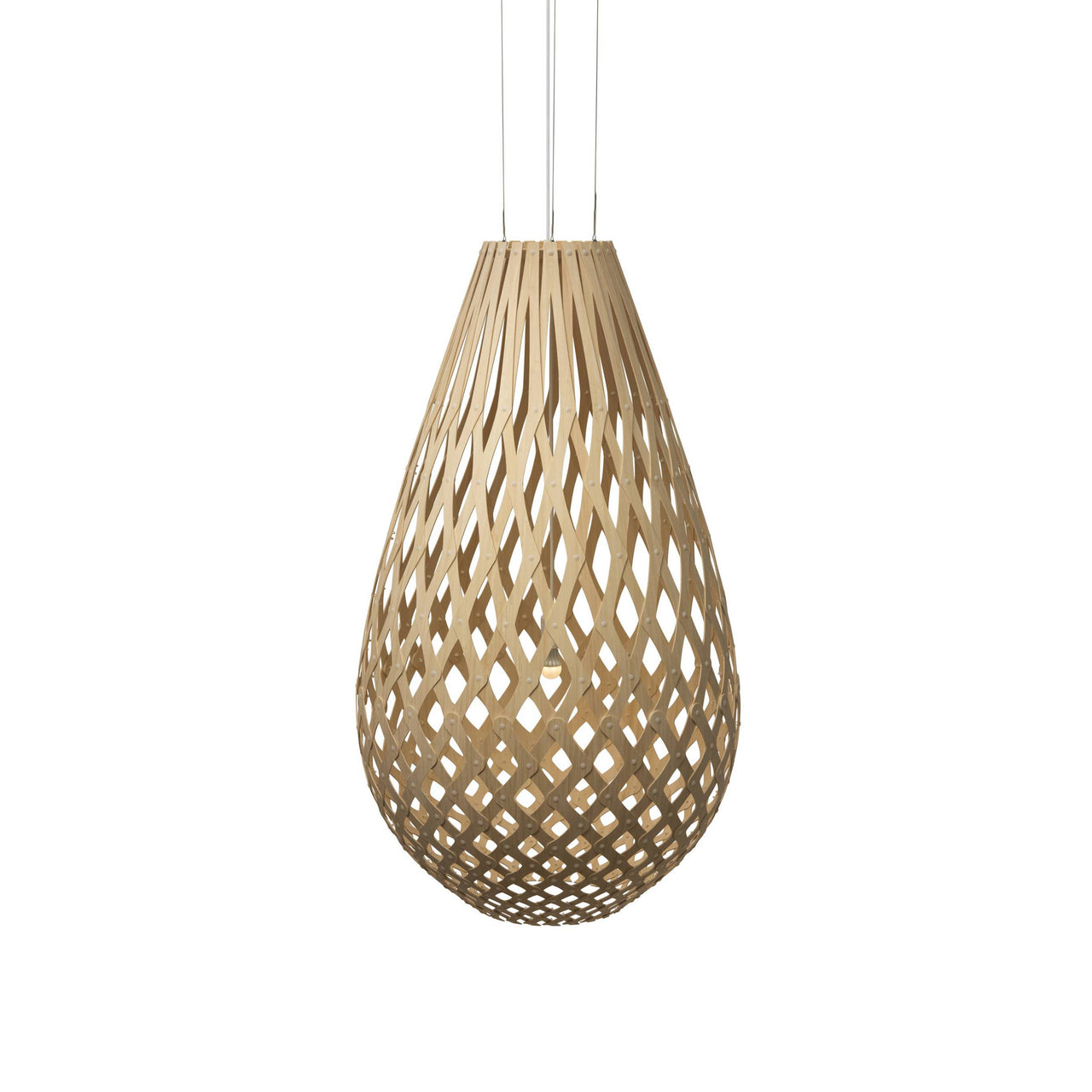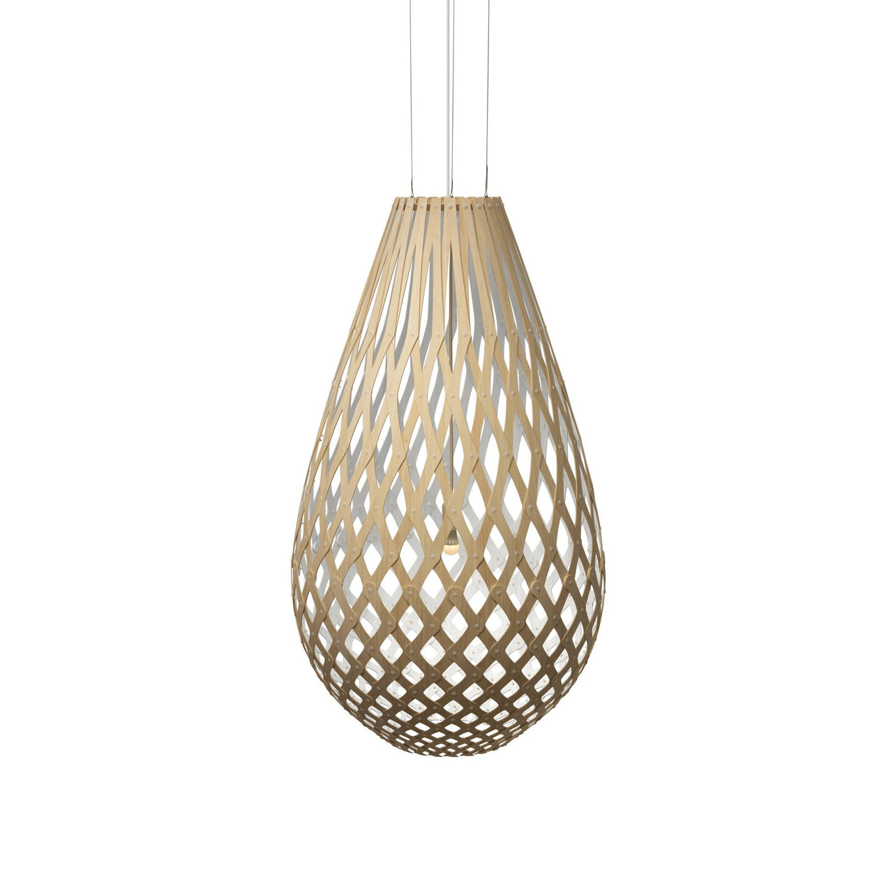 "Koura is the Maori name for the small fresh water shrimps that live in our rivers. They curl up in this shape. This shape is mirrored again in the similar woven traps used for catching them," New Zealand designer David Trubridge has observed, in reference to the inspiration for his striking Kouros pendant lamp. A passion for the environment and earth drives the construction of all David's work, primarily made of renewable bamboo and flat-packed to reduce freighting and packaging resources and the identical pieces make home assembly a snap, literally. Endlessly adaptable, the light is available in 2 sizes and 9 stock colors (custom colors upon request) in natural or painted bamboo with nylon clip fasteners. The celebrated designing craftsman ended up in his adopted home of New Zealand after he, his wife and their two sons sold everything and set off on a yacht for a world adventure. It culminated in 1985 when they decided to remain there. While an artist-in-residence, he built a house and suddenly found himself with further commissions. Before realizing homes, lamps and furniture, David left Newcastle University in 1972 with a degree in Naval architecture. His work has appeared in countless museums, including the Victoria & Albert and the Pompidou Centre. That barely scratches the surface of his fascinating story and work ethos.