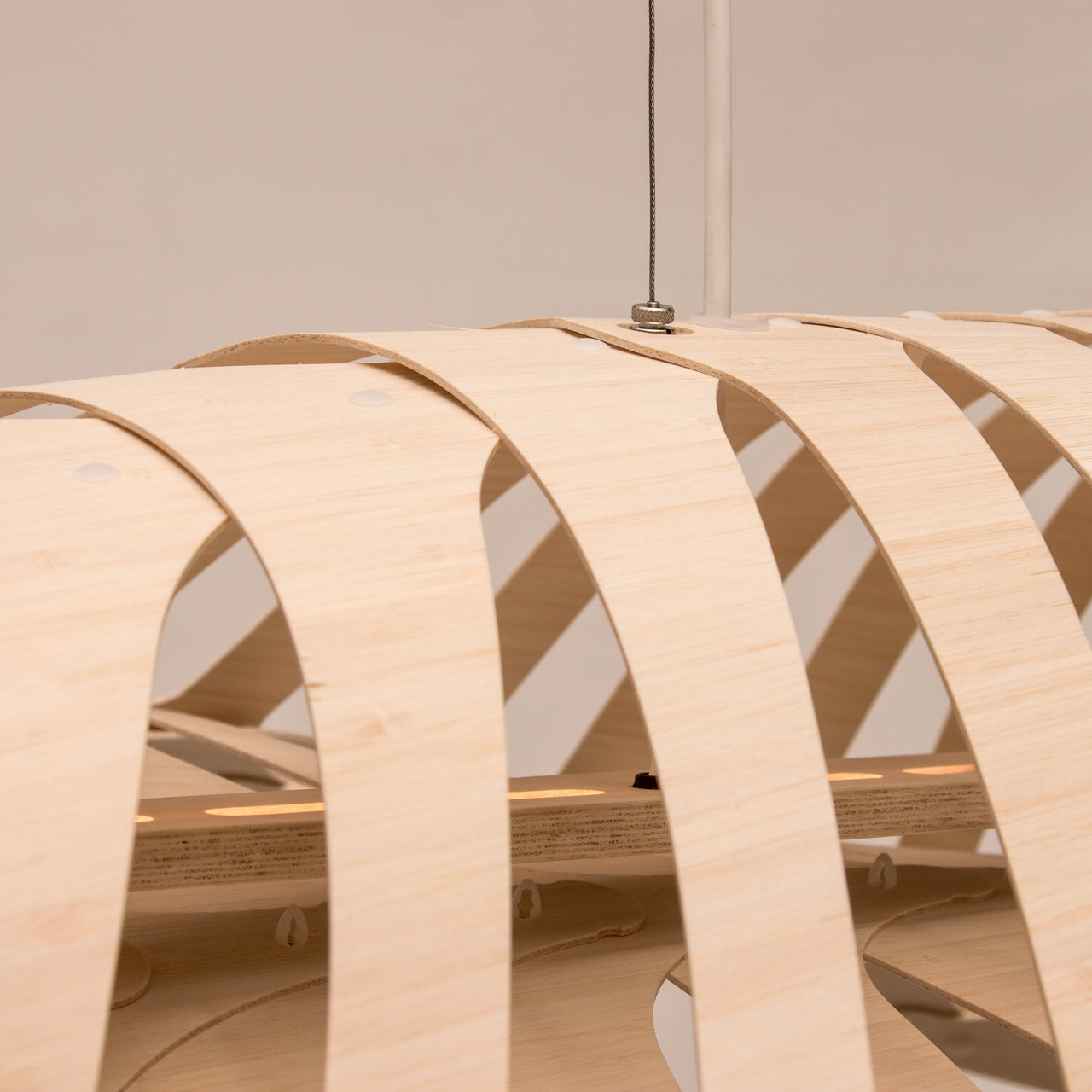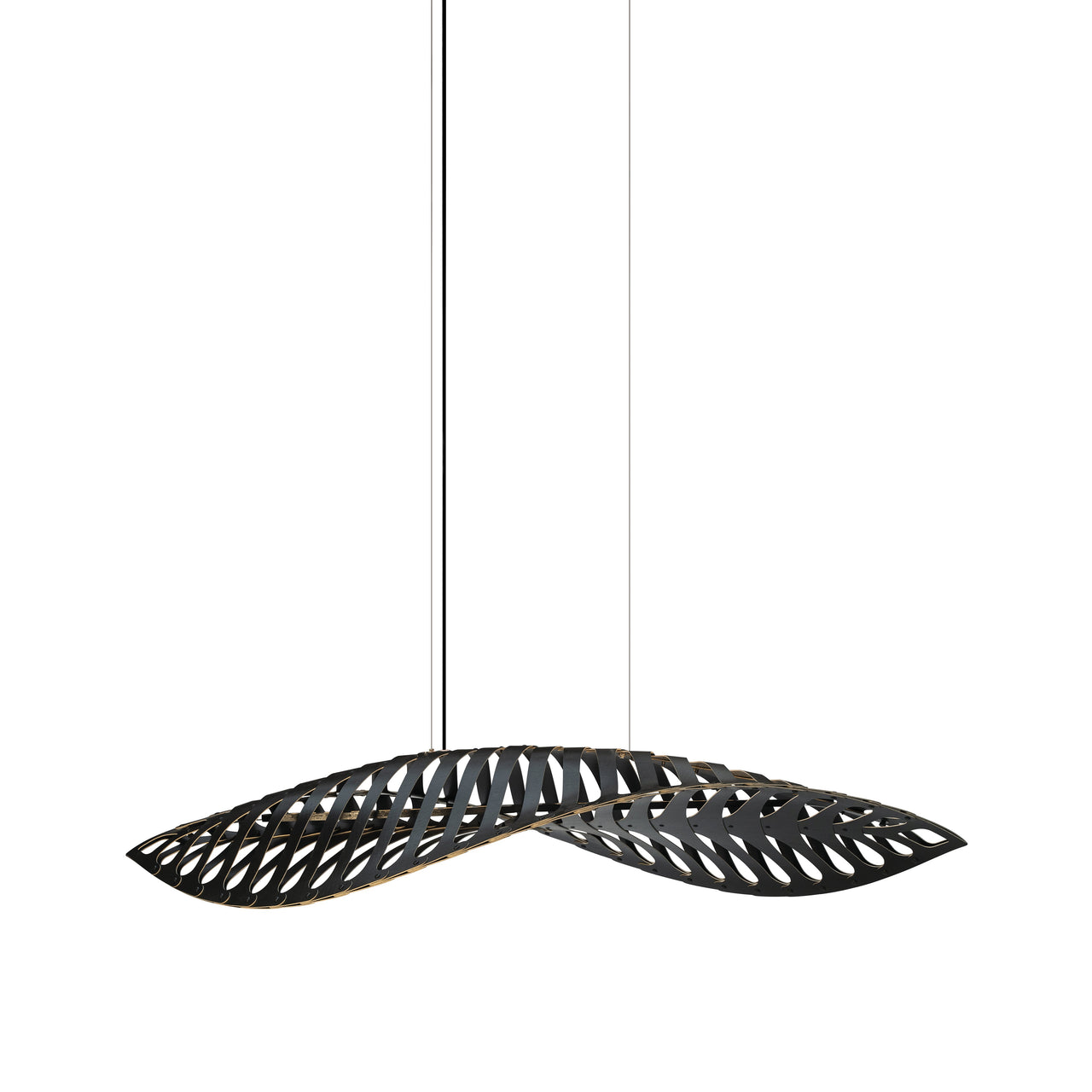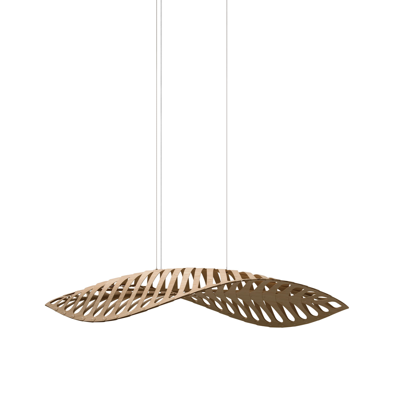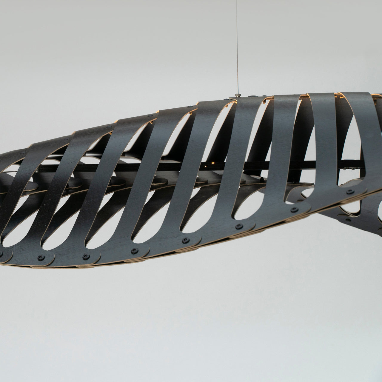 For his magnificent feature light Navicula, designer and New Zealand-based outdoorsman David Trubridge went rolling in the deep, at least metaphorically. The layered shape was Inspired by microscopic diatoms, a strain of algae, that float around in the oceans. Thin pieces of bamboo plywood curve and flow, a marvel of computer-assisted woodcutting. Lit from within by a row of LED pinpoint lights, Navicula casts magical patterns in its wake. Flat-packed for eco-friendly shipping and a snap to assemble with furnished nylon clips.