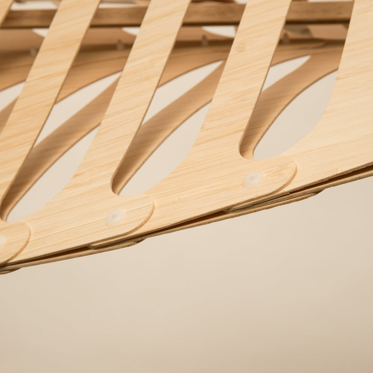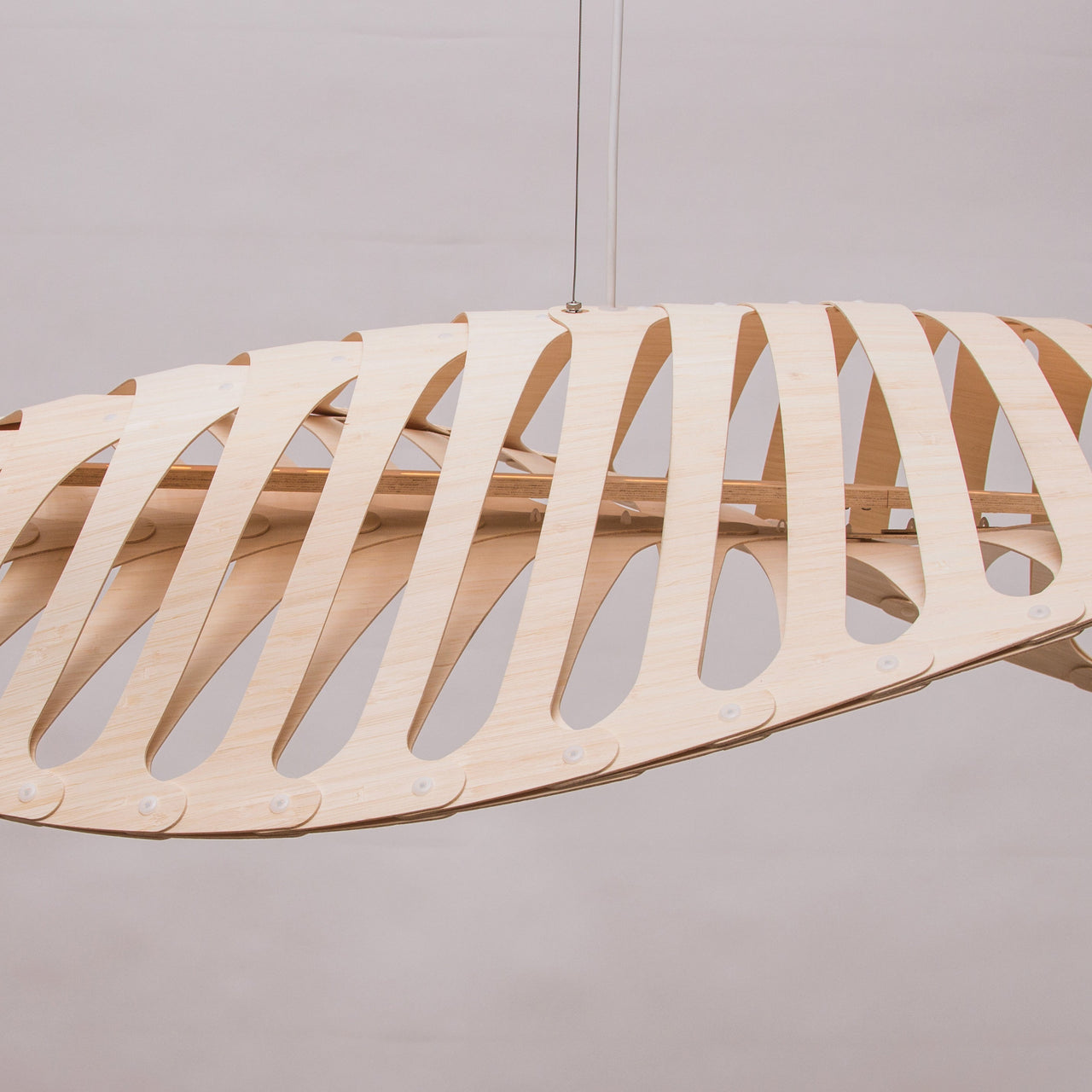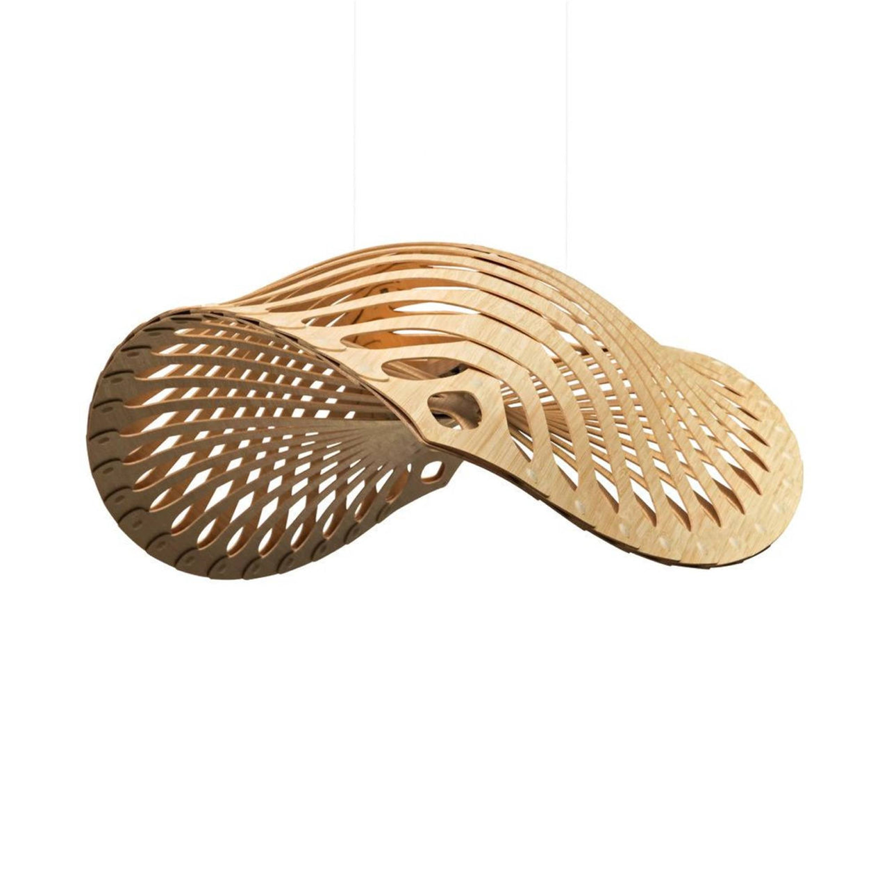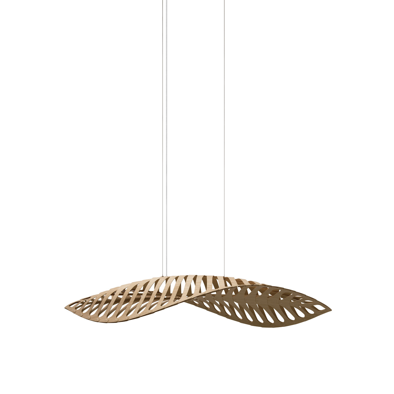 For his magnificent feature light Navicula, designer and New Zealand-based outdoorsman David Trubridge went rolling in the deep, at least metaphorically. The layered shape was Inspired by microscopic diatoms, a strain of algae, that float around in the oceans. Thin pieces of bamboo plywood curve and flow, a marvel of computer-assisted woodcutting. Lit from within by a row of LED pinpoint lights, Navicula casts magical patterns in its wake. Flat-packed for eco-friendly shipping and a snap to assemble with furnished nylon clips.