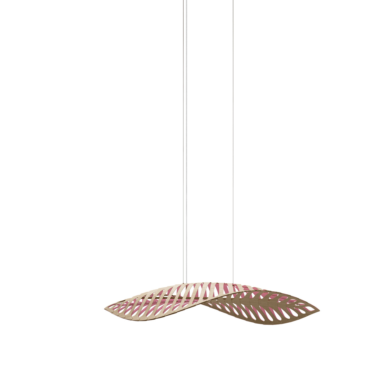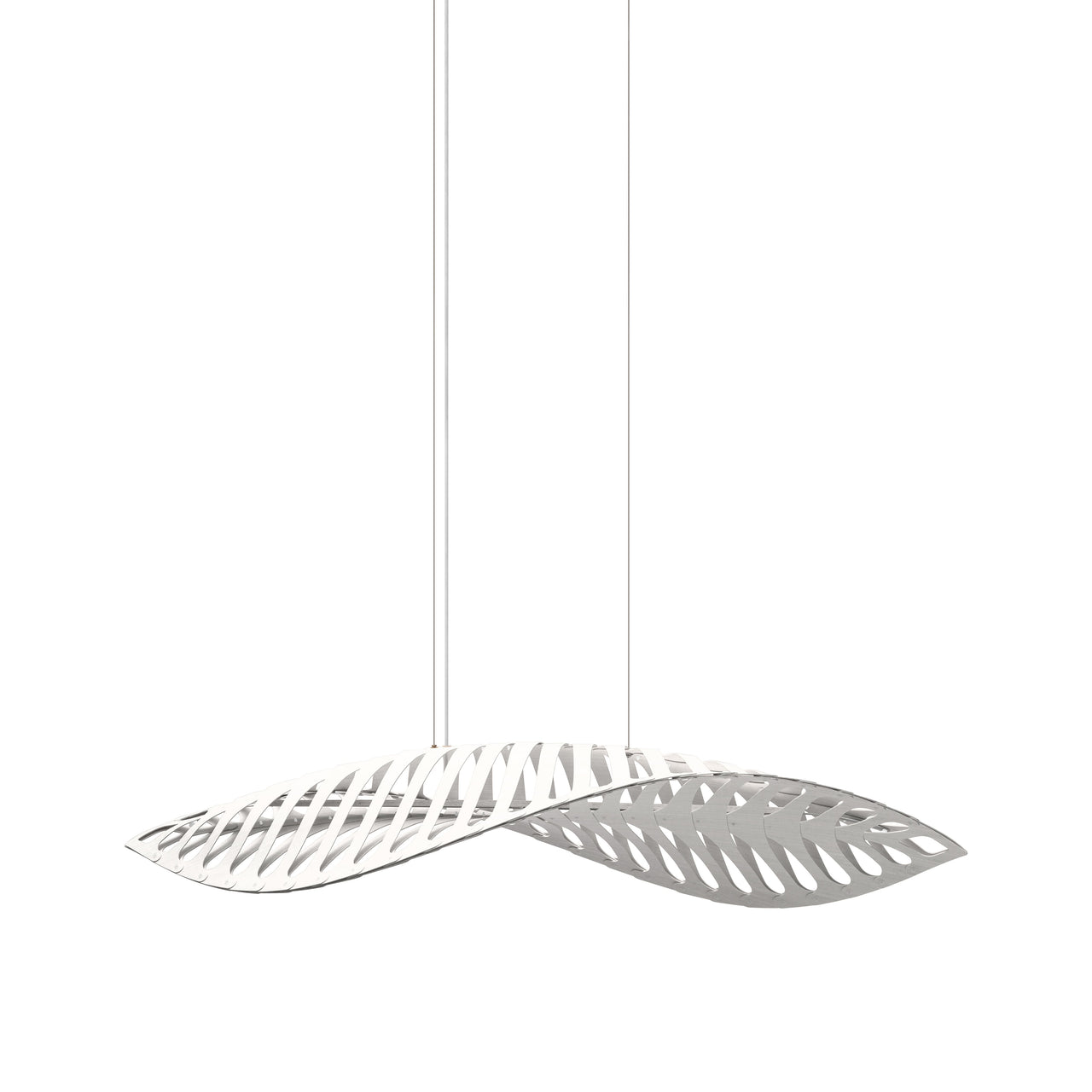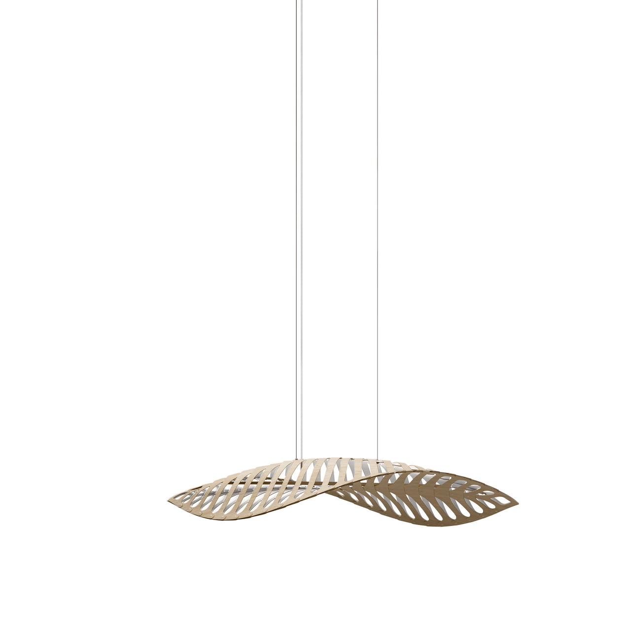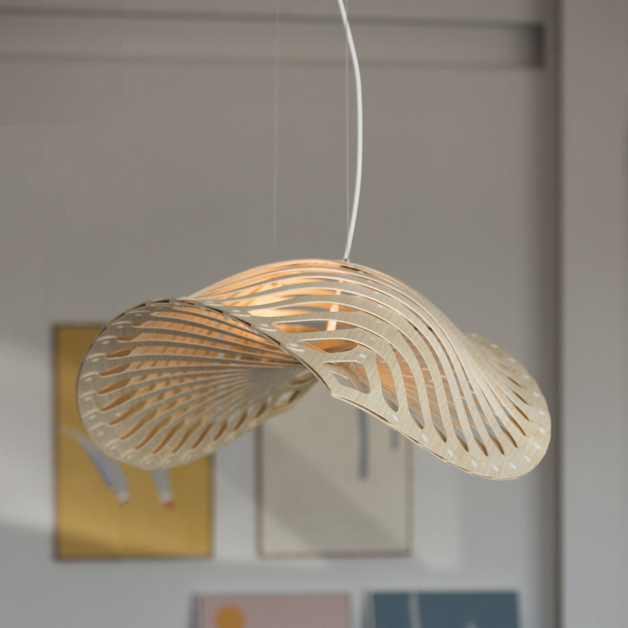 For his magnificent feature light Navicula, designer and New Zealand-based outdoorsman David Trubridge went rolling in the deep, at least metaphorically. The layered shape was Inspired by microscopic diatoms, a strain of algae, that float around in the oceans. Thin pieces of bamboo plywood curve and flow, a marvel of computer-assisted woodcutting. Lit from within by a row of LED pinpoint lights, Navicula casts magical patterns in its wake. Flat-packed for eco-friendly shipping and a snap to assemble with furnished nylon clips.