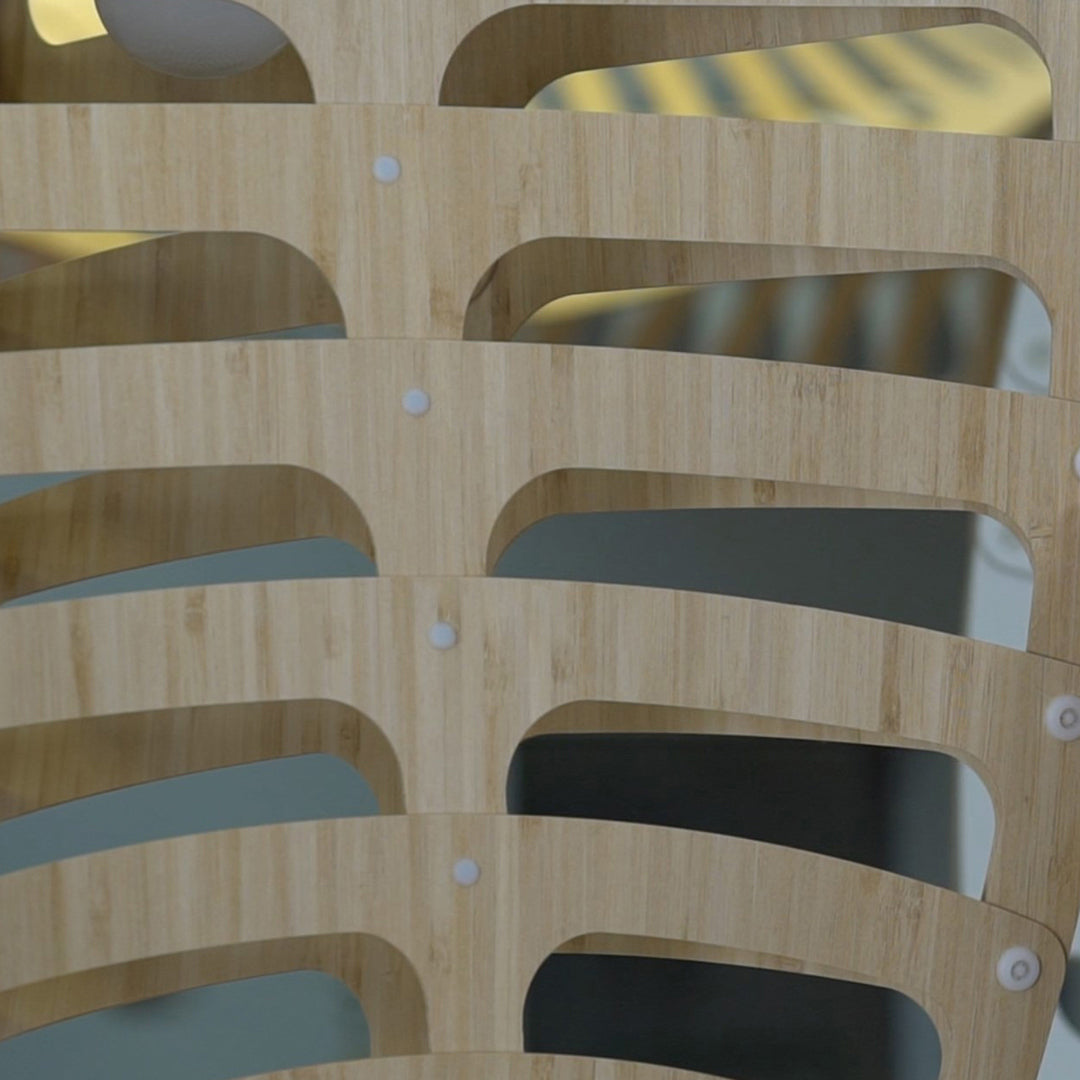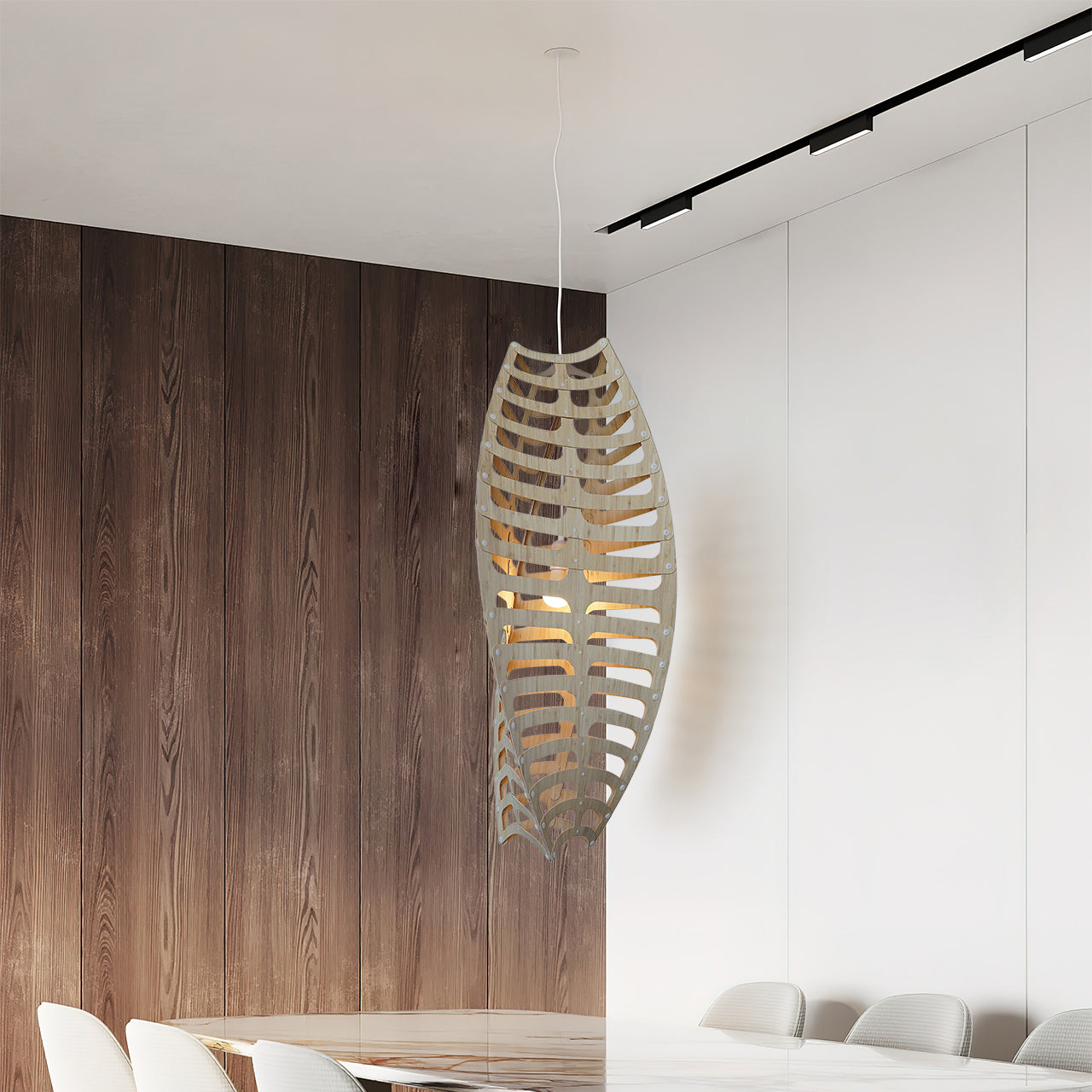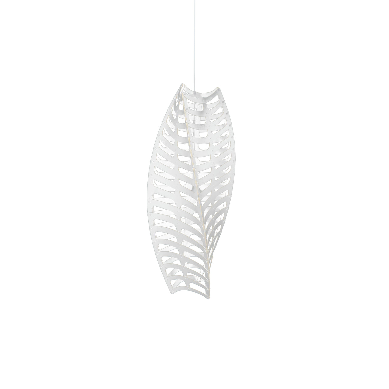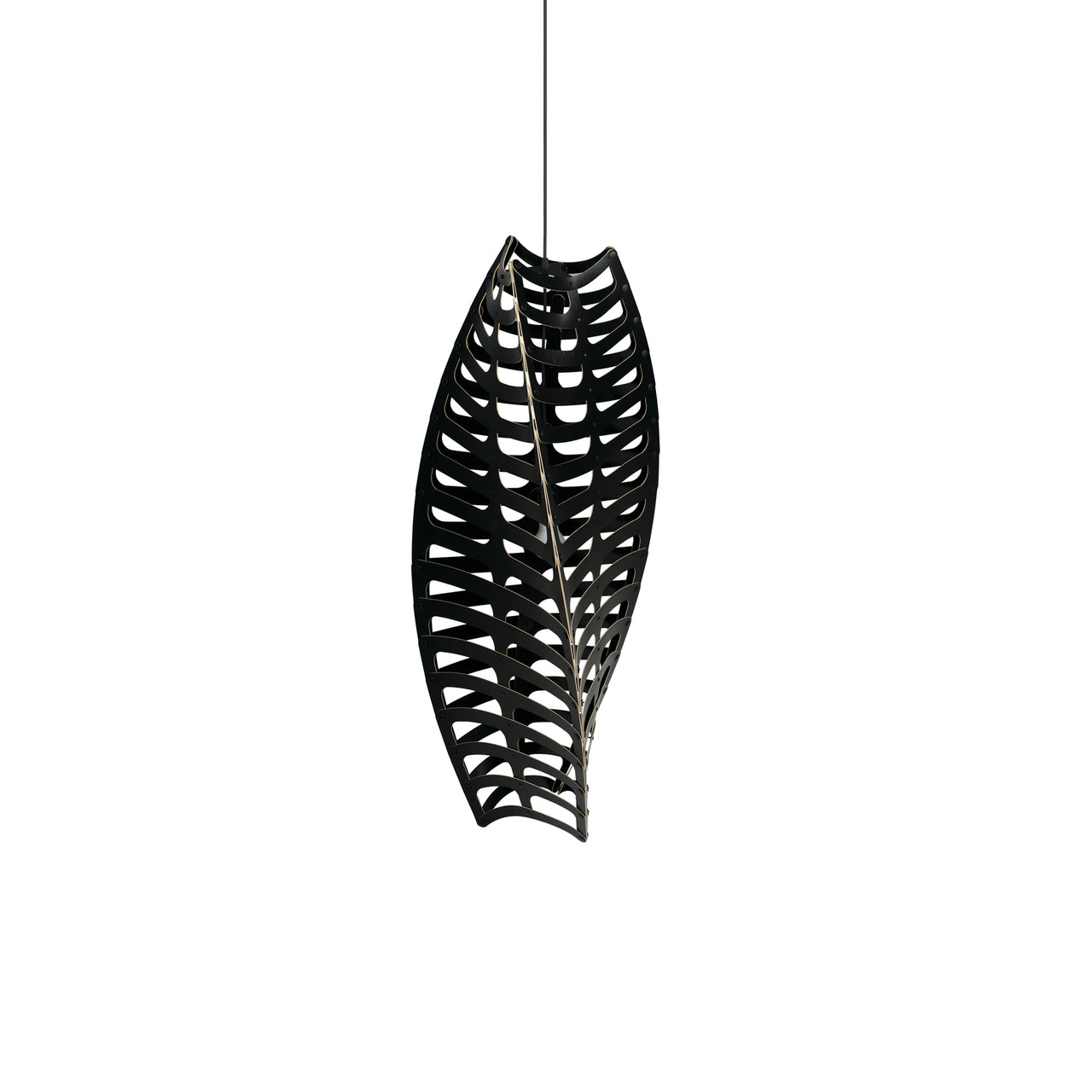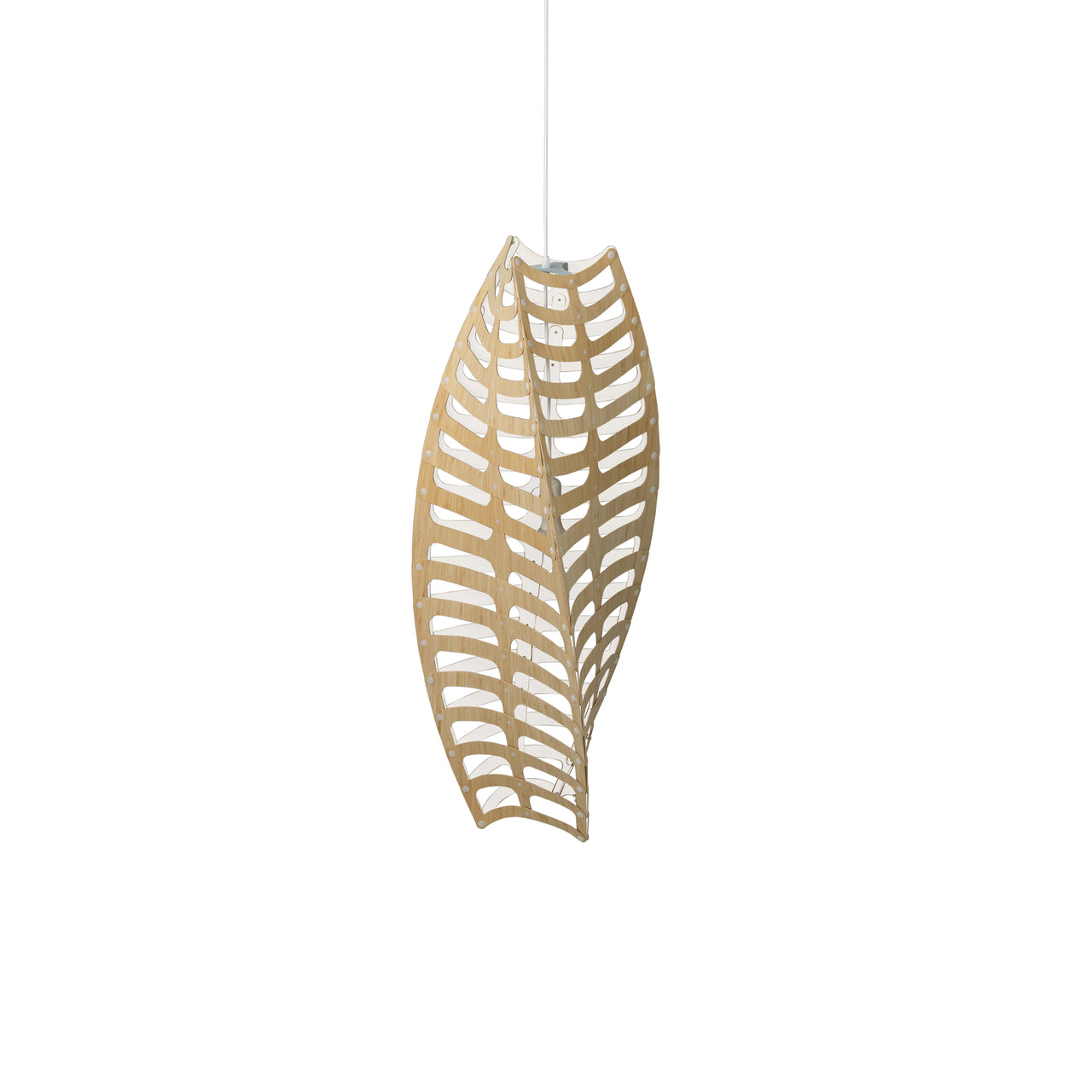 Toru’s vertical model makes for an especially stunning view of the mesmerizing twist of its unique triple-sided shape, appropriately named after the Te Reo Māori word for "3." Inspired by the natural beauty of microscopic diatoms, David Trubridge’s pendant adds a sculptural note in a range of colored bamboo choices while emitting beautiful shadow patterns.