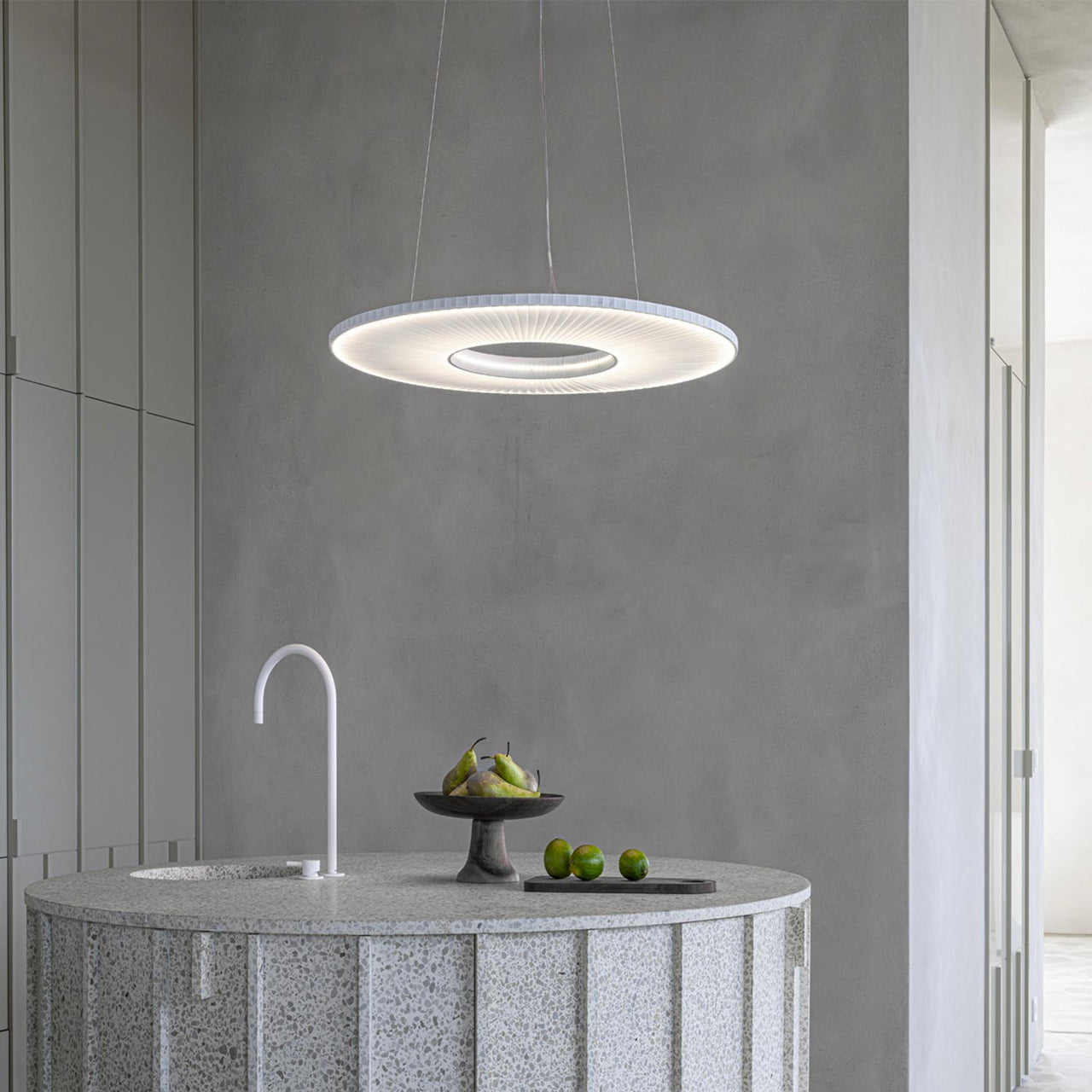 The Iris Pendant Horizontal features a slim, elongated design that provides ambient lighting. Its simple style allows it to fit effortlessly into different interior spaces. Constructed with high-quality materials, the pendant is durable and visually appealing. Its horizontal orientation is ideal for areas requiring a sleek and slender light source.