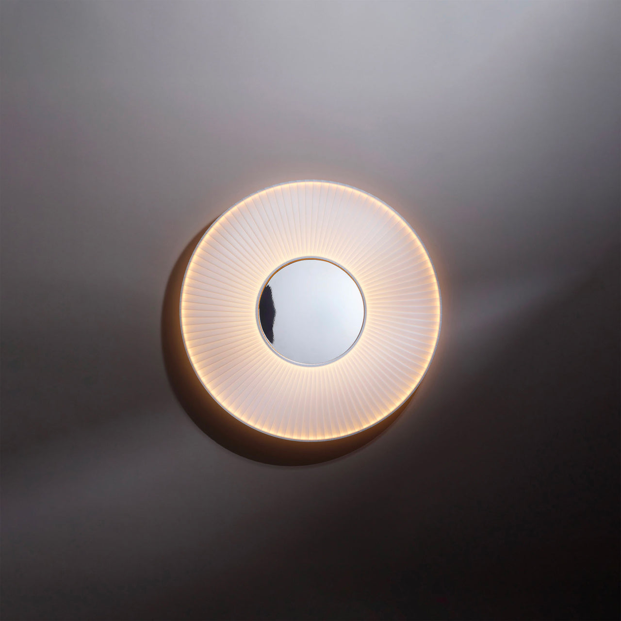 The Iris Wall/Ceiling Lamp with Mirror blends lighting and reflection to create a striking centerpiece. The integrated mirror enhances the sense of space, while the surrounding light offers soft ambient illumination. Designed with precision, this fixture is both practical and visually engaging. It can be installed on walls or ceilings, fitting seamlessly into different interior settings.