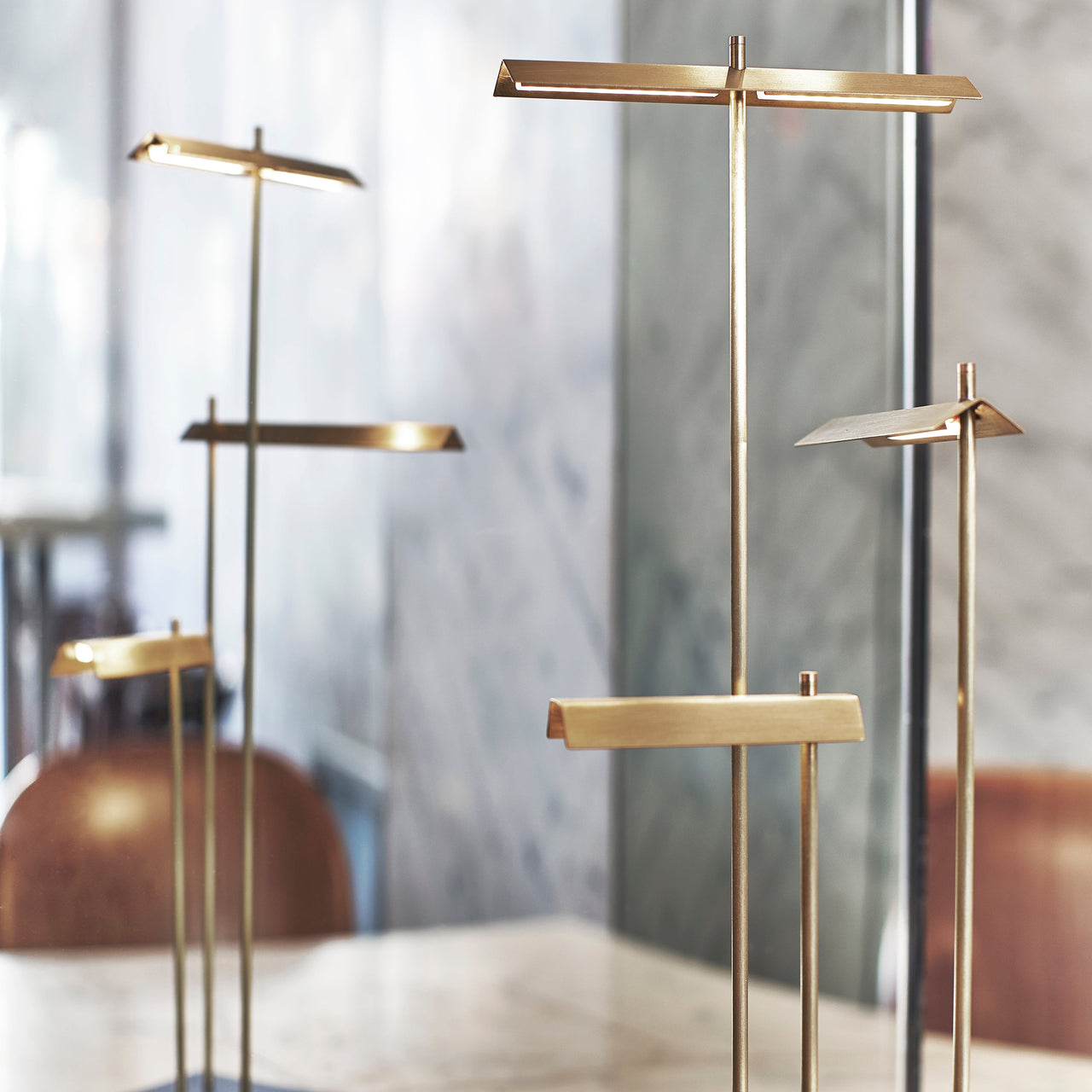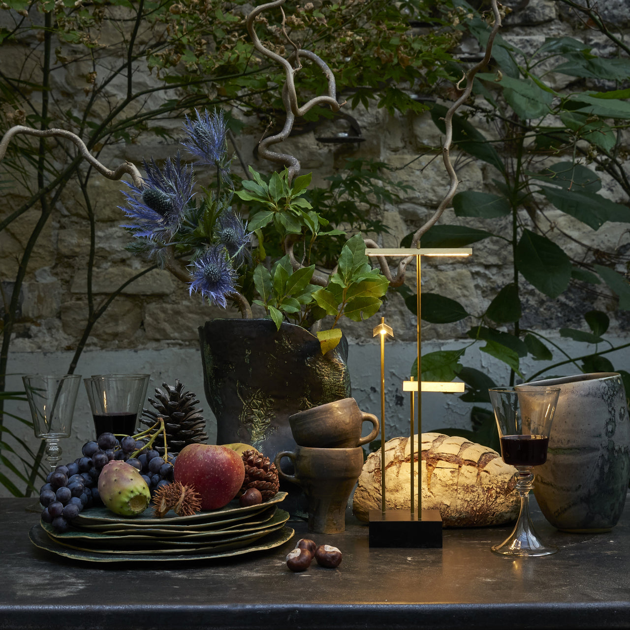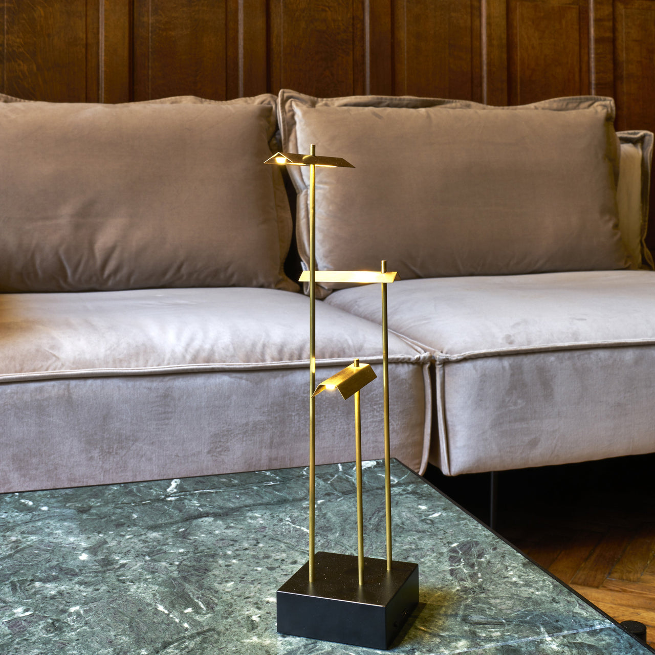 His mesmerizing table lamp takes an architectural form in his oft-preferred medium of solid brass wire, anchored with a black metal base. Lit by small LEDs, it spreads warm illumination anywhere since it’s also completely mobile and powered by a rechargeable battery.