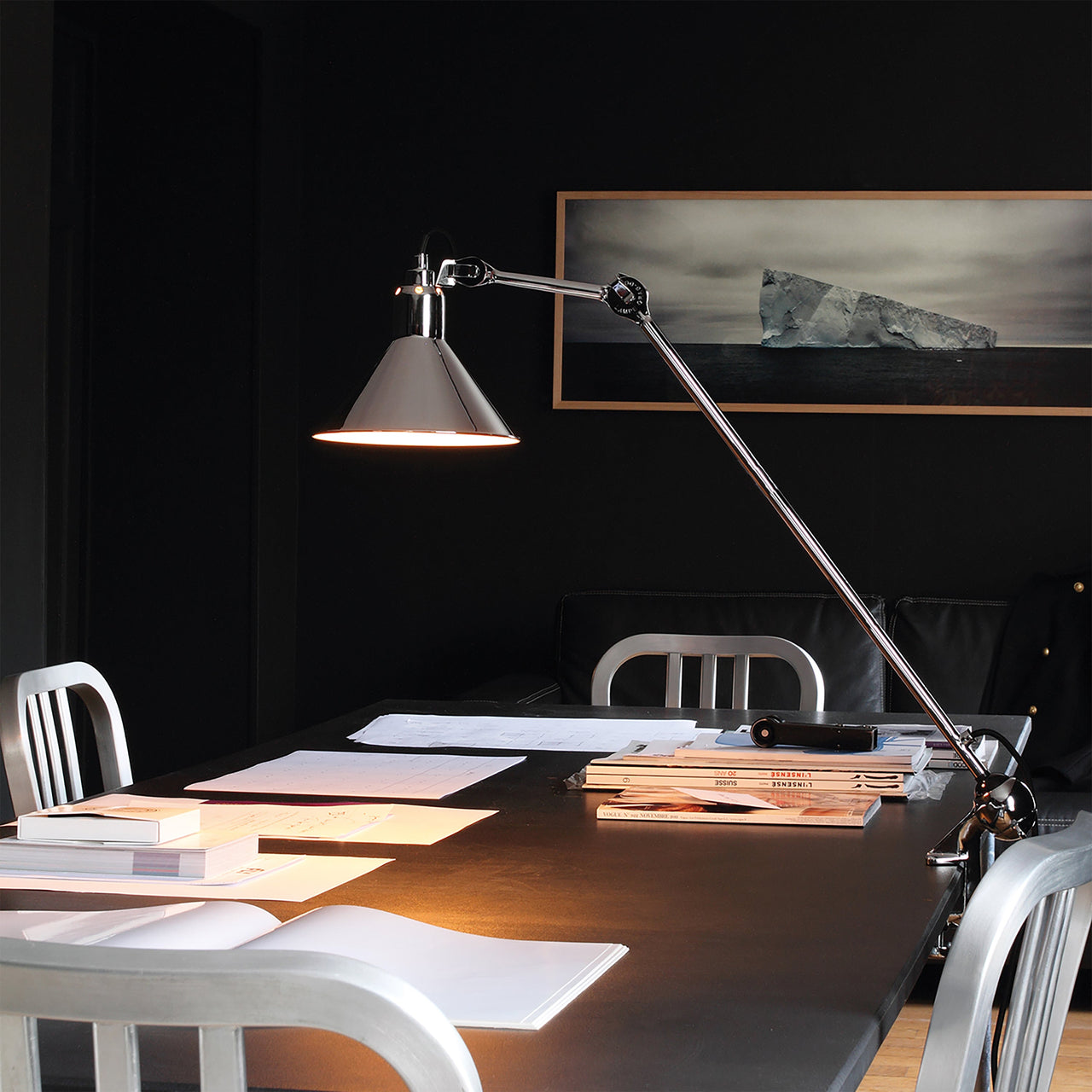 Emblematic of the series, N°201 was an early success and widely adopted by architects when Lampe Gras was first introduced a century ago. Strikingly simple and ergonomically ahead of its time, the innovative articulated design was as useful as it was handsome. With a clamp base to fit most desktops, the task light pairs its black steel armature with a wide choice of finishes for the accompanying metal shade in either comic or round shape as desired.