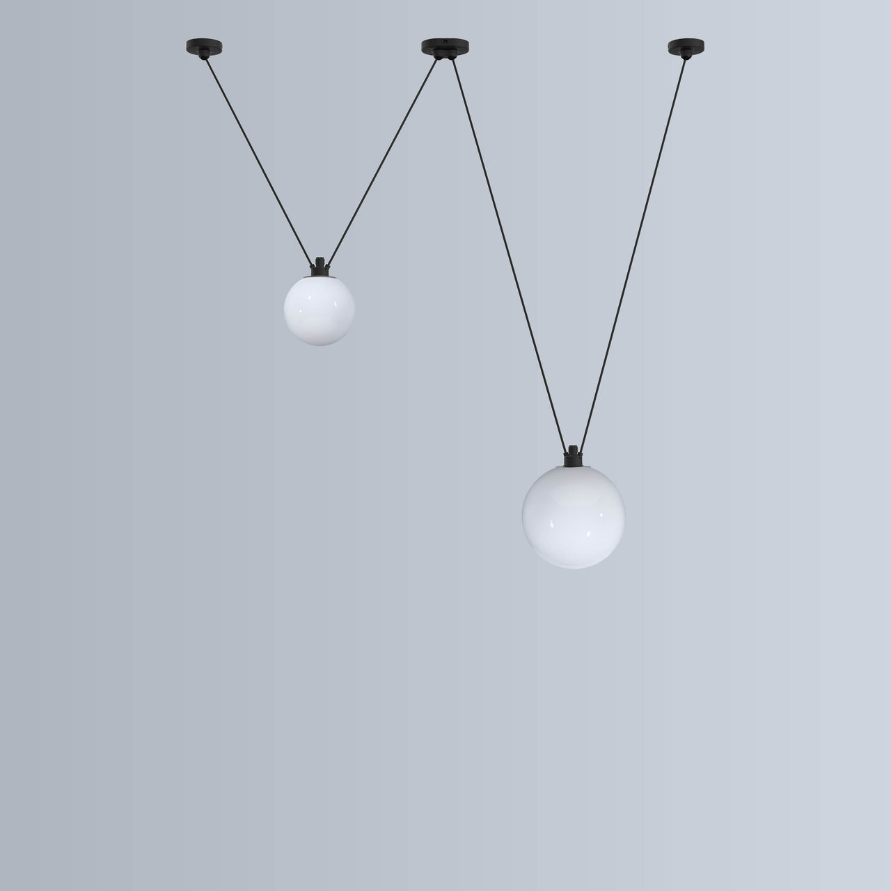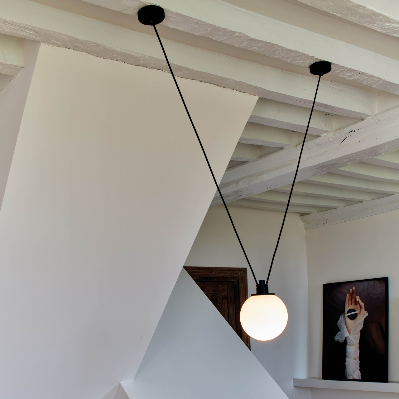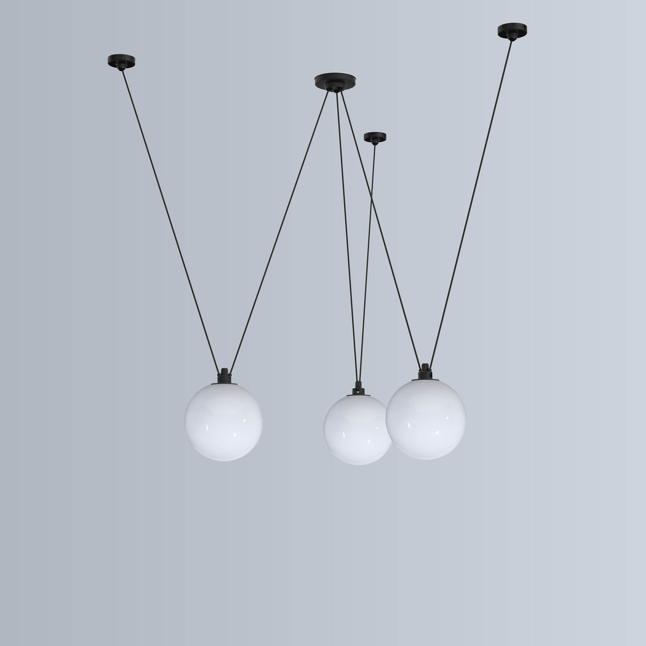 The Les Acrobates N°324 Pendant Lamp features a spherical opal glass shade suspended by four adjustable cables. Its adaptable design allows it to be installed individually or arranged with other fixtures for customized lighting compositions. The pendant is available in finishes such as black and raw copper, providing options to complement various interiors. With its clean design and versatile mounting possibilities, this lamp enhances the character and functionality of spaces.