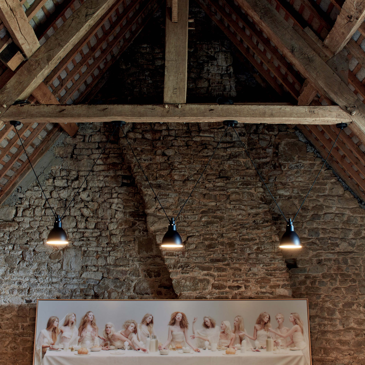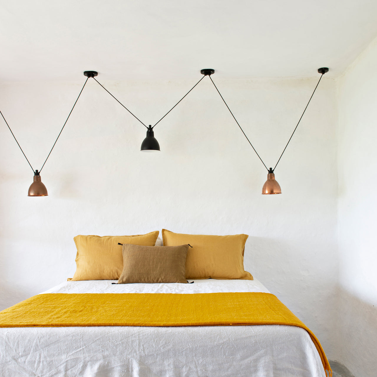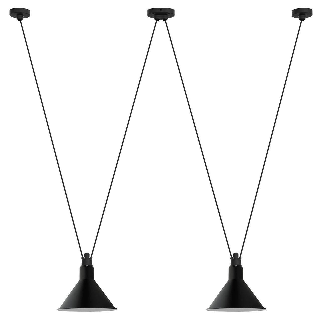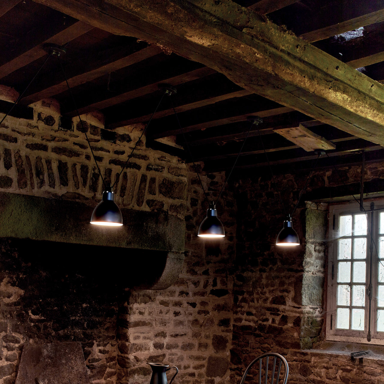 The Les Acrobates N°324 Large Pendant Lamp features a conical shade elegantly suspended by four cables, creating an open and dynamic look. Its design supports flexible arrangements, allowing it to be installed individually or grouped with other fixtures for personalized compositions. The pendant comes in finishes such as black and raw copper, offering choices to match various interior themes. With its clean lines and adaptable installation options, the lamp adds a distinctive and functional touch to spaces.