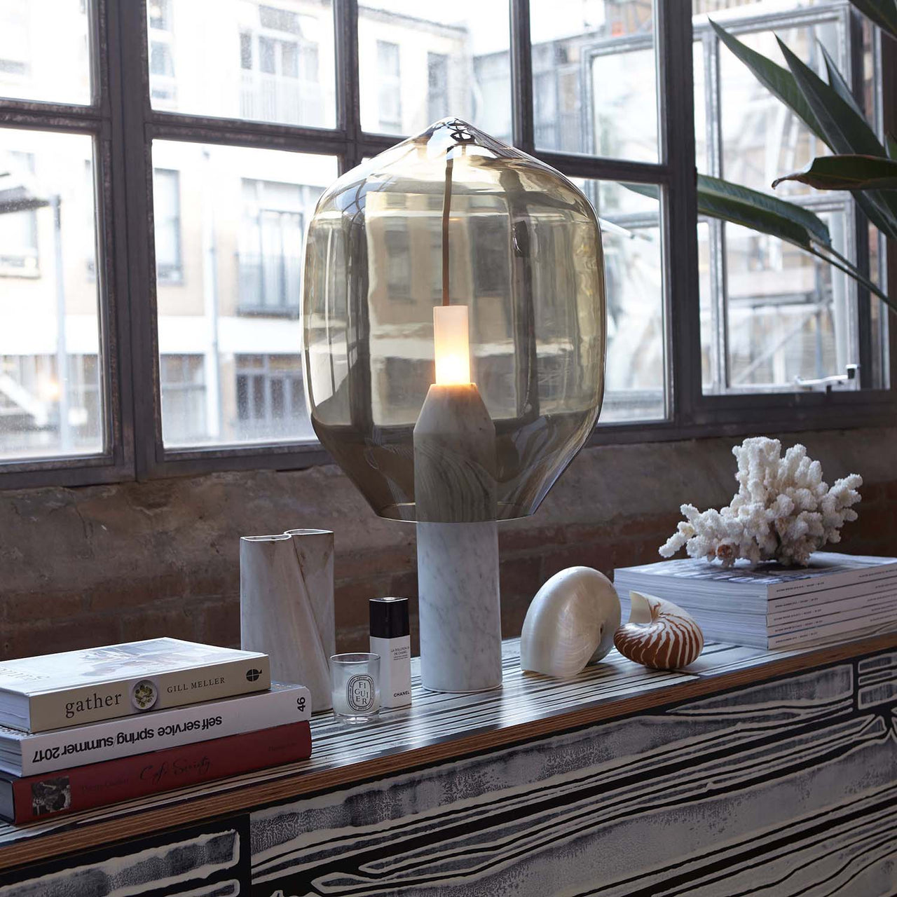 A beacon of inspired design in every sense of the word, Lighthouse combines disparate materials in a luxurious synthesis. Voluptuous in form, the mouth-blown Venetian glass shade balances on an industrially engineered aluminum arm fixed to a richly sensual marble column. Designers Ronan and Erwan Bouroullec may have initiated a precarious equipoise but their sculptural lamp proves their continued mastery of effect.