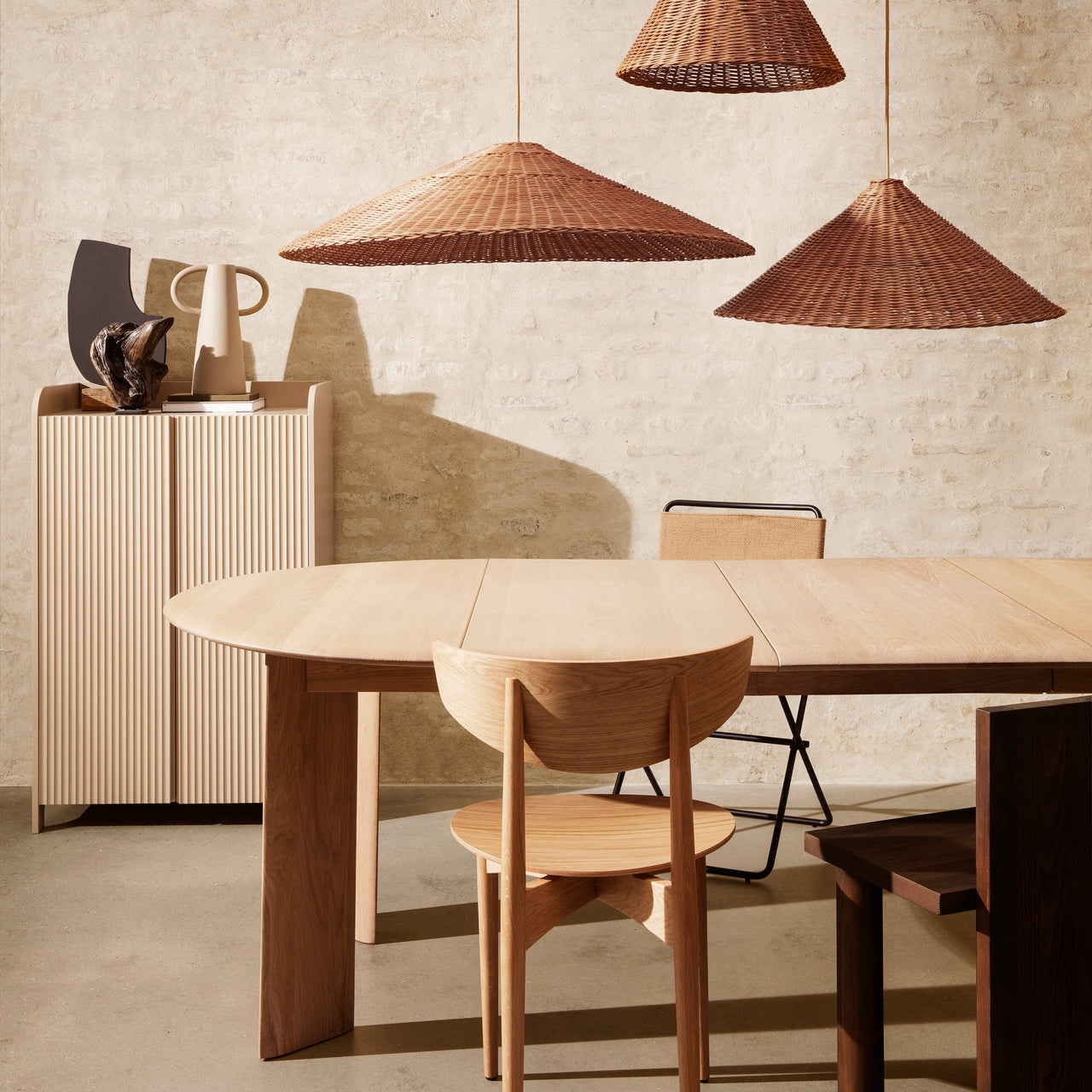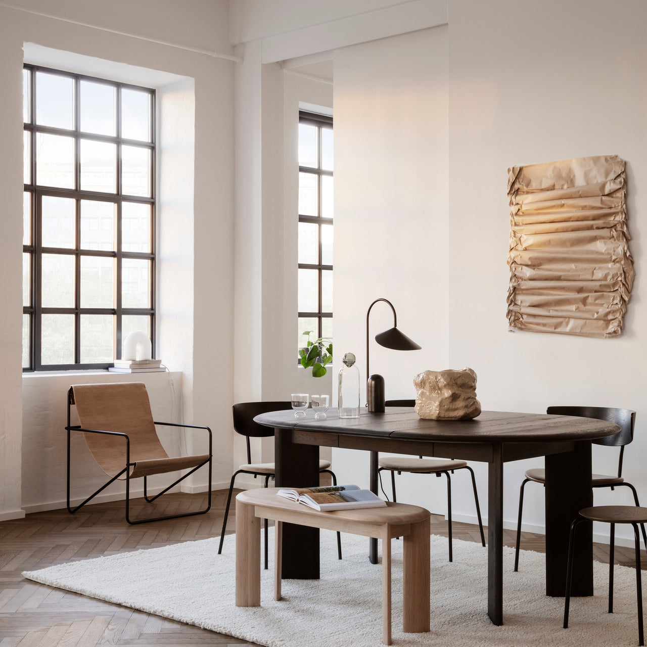 Fashioned entirely from solid oak, the broad, sculpted legs add a subtle interest to Ferm Living's "forever" dining table. Bevel is available in either a natural oiled or black oiled finish, and both the tabletop and legs are minimally detailed with gently rounded edges for a refined expression. Beautifully crafted, the table includes an extension leaf to accommodate additional guests and promises years of mealtime contentment.